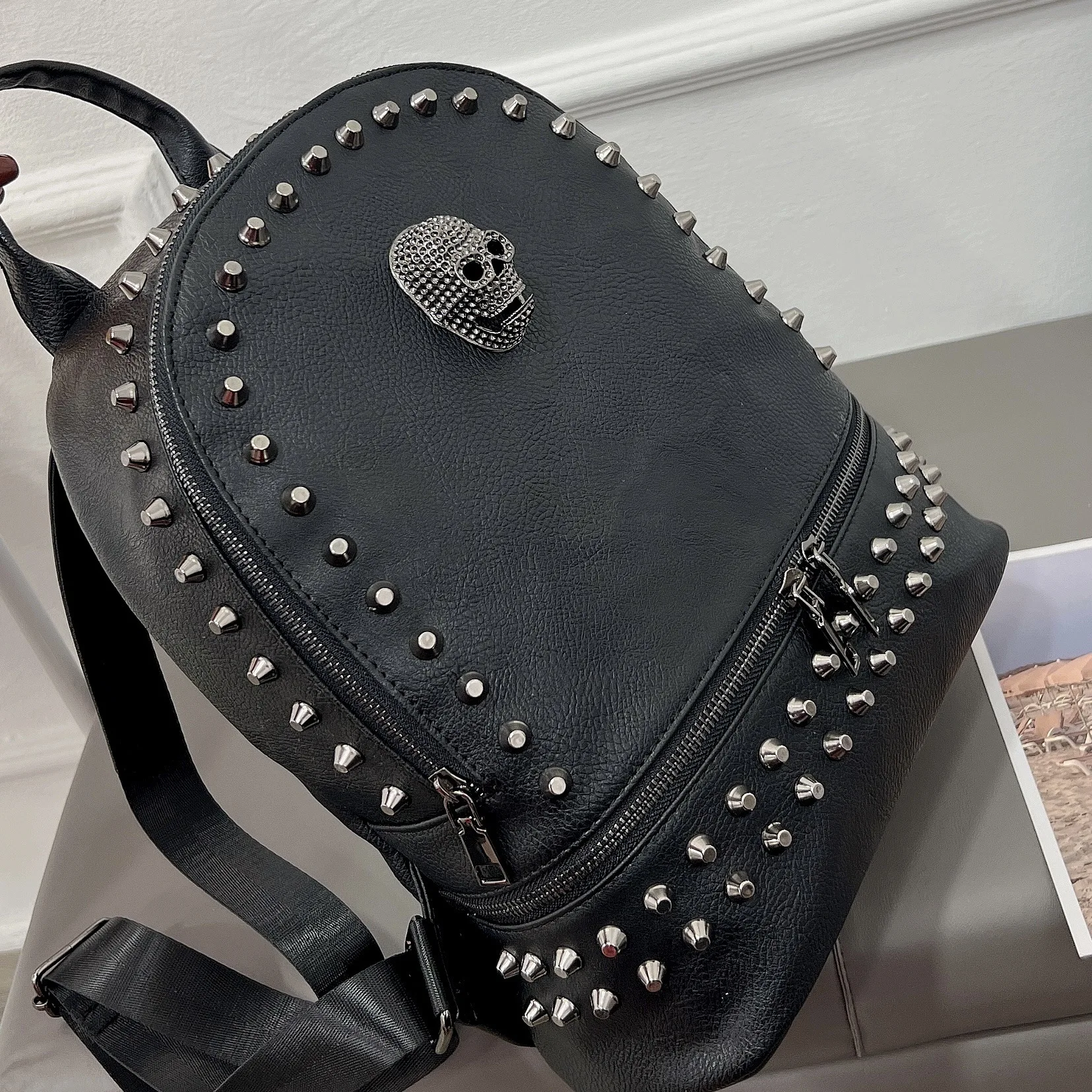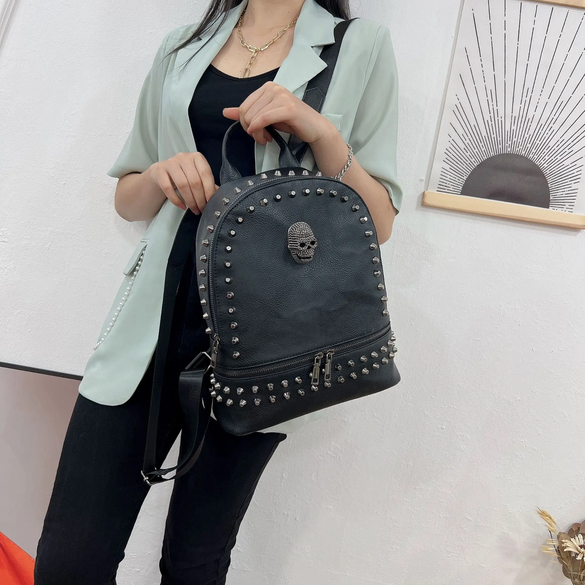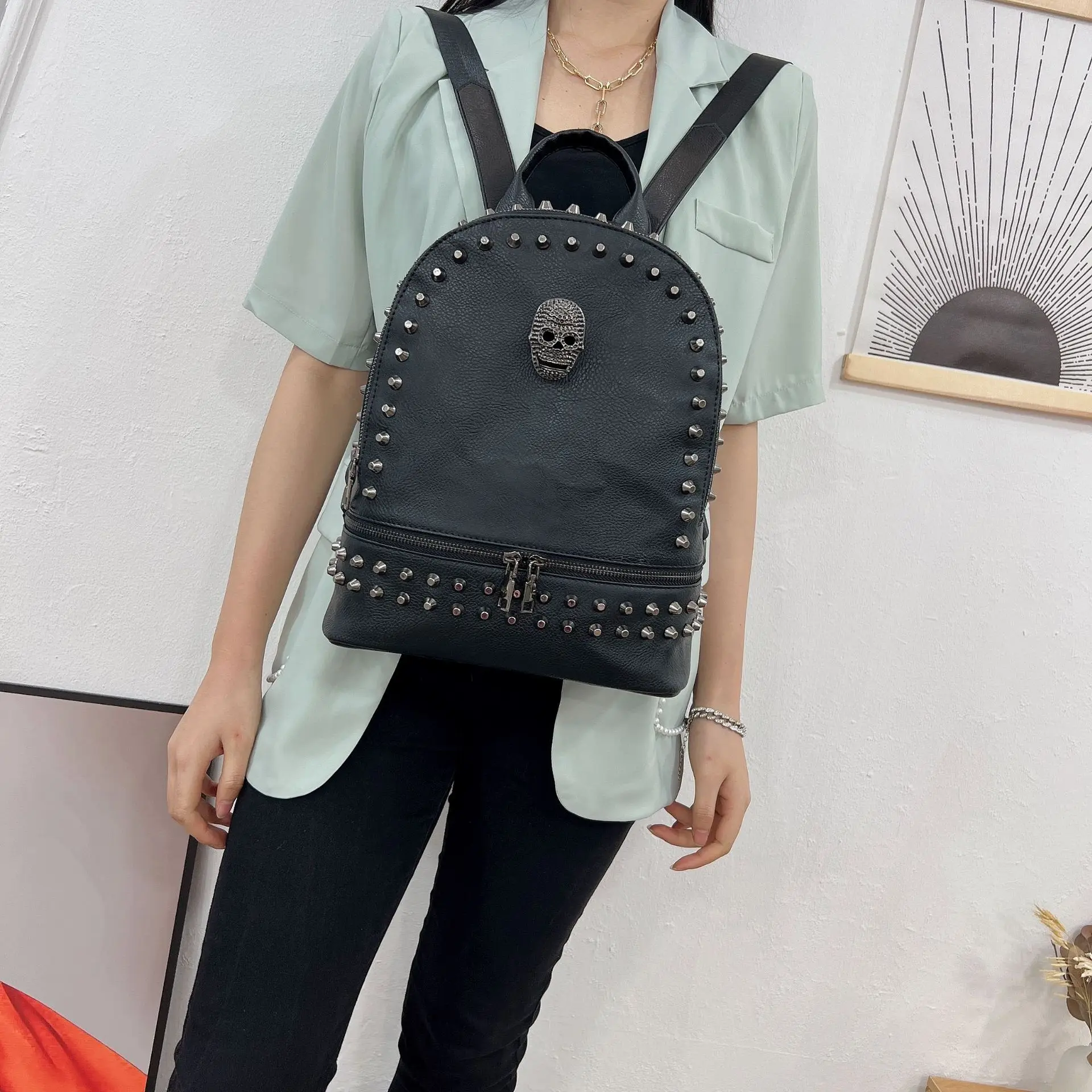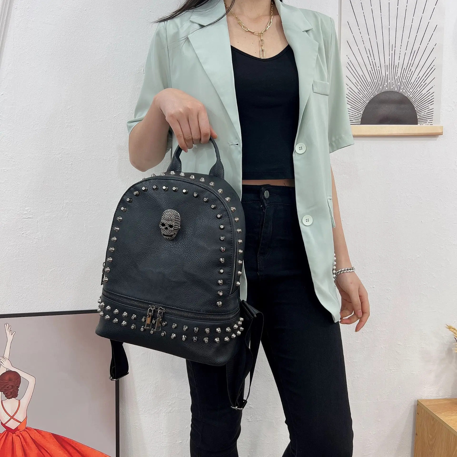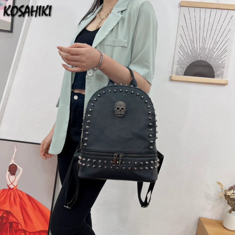 Weiyinxing All Match Soft Leather Rivet Skull Backpack Women Casual Punk Streetwear Schoolbags Y2k Aesthetic Trendy Vintage Backpacks