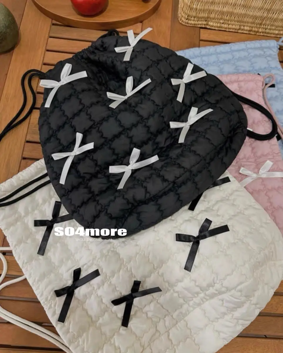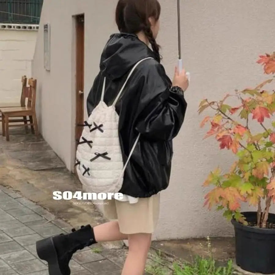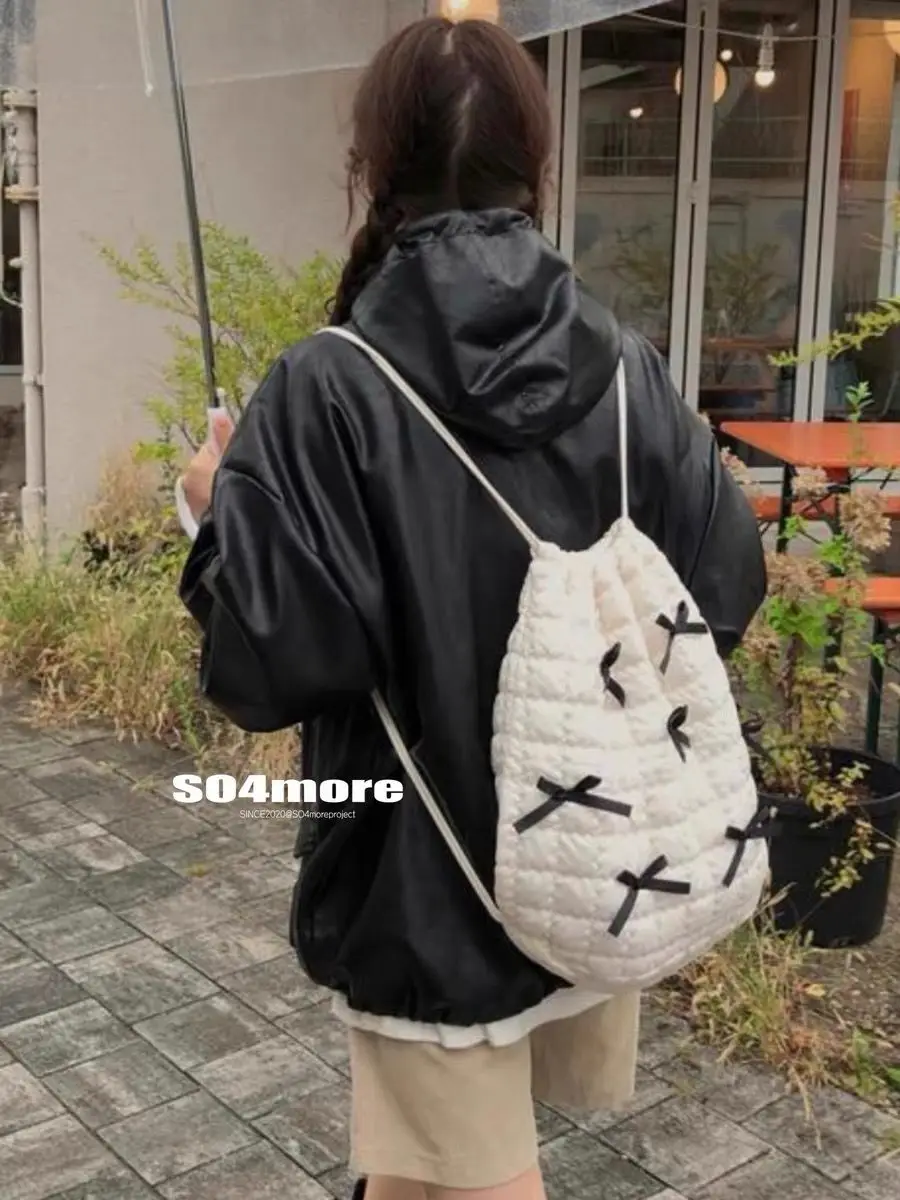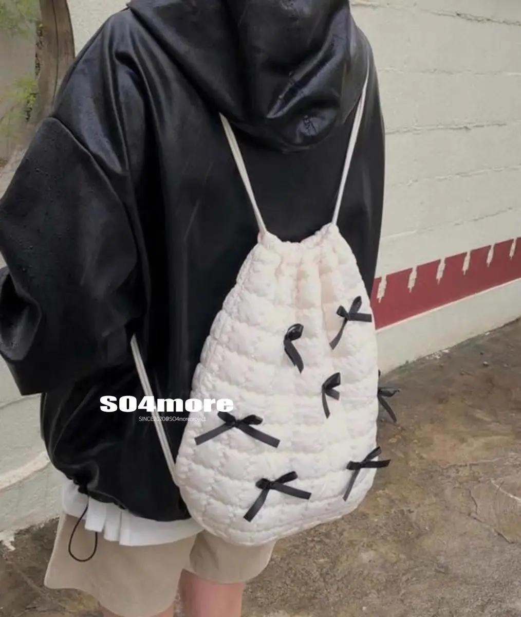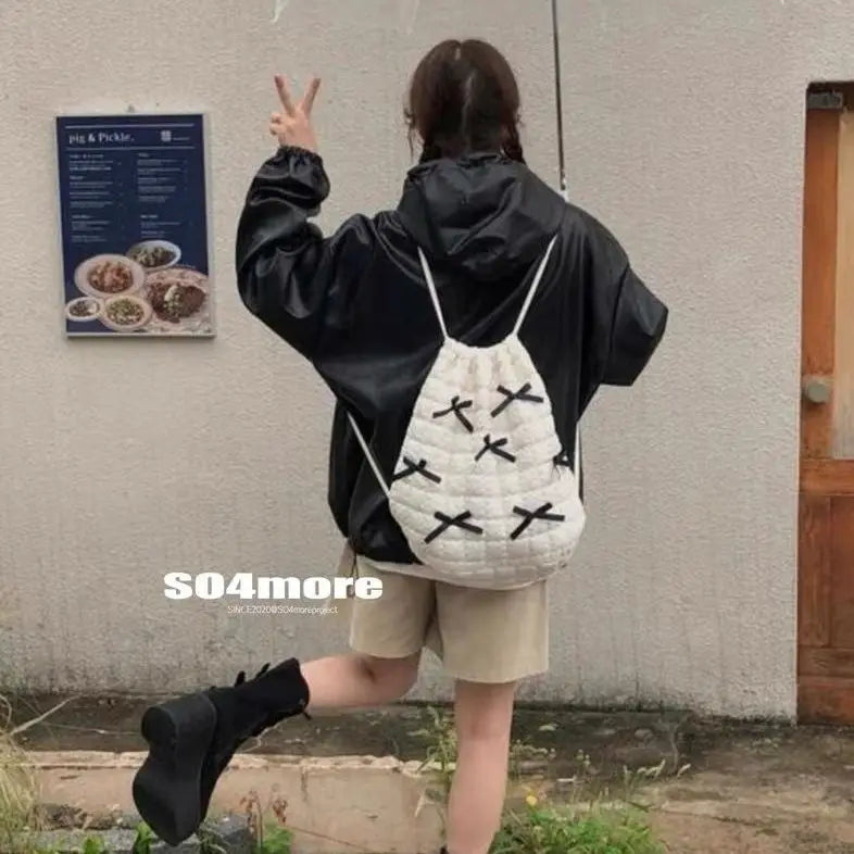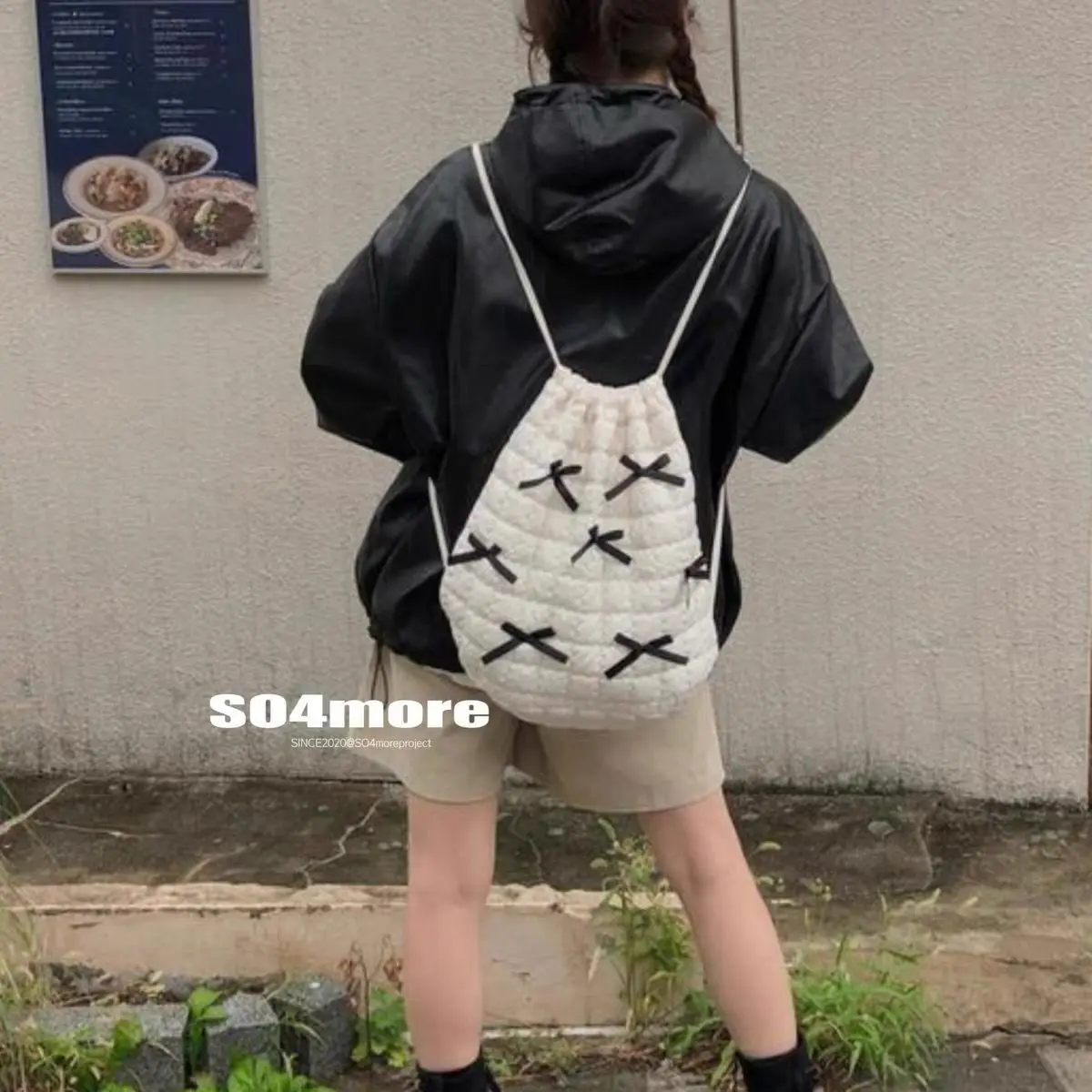 Weiyinxing Black Bow Design Cotton Drawstring Backpack 2024 Winter Korean Fashion Y2K Big Soft Backpacks Lady Back Pack