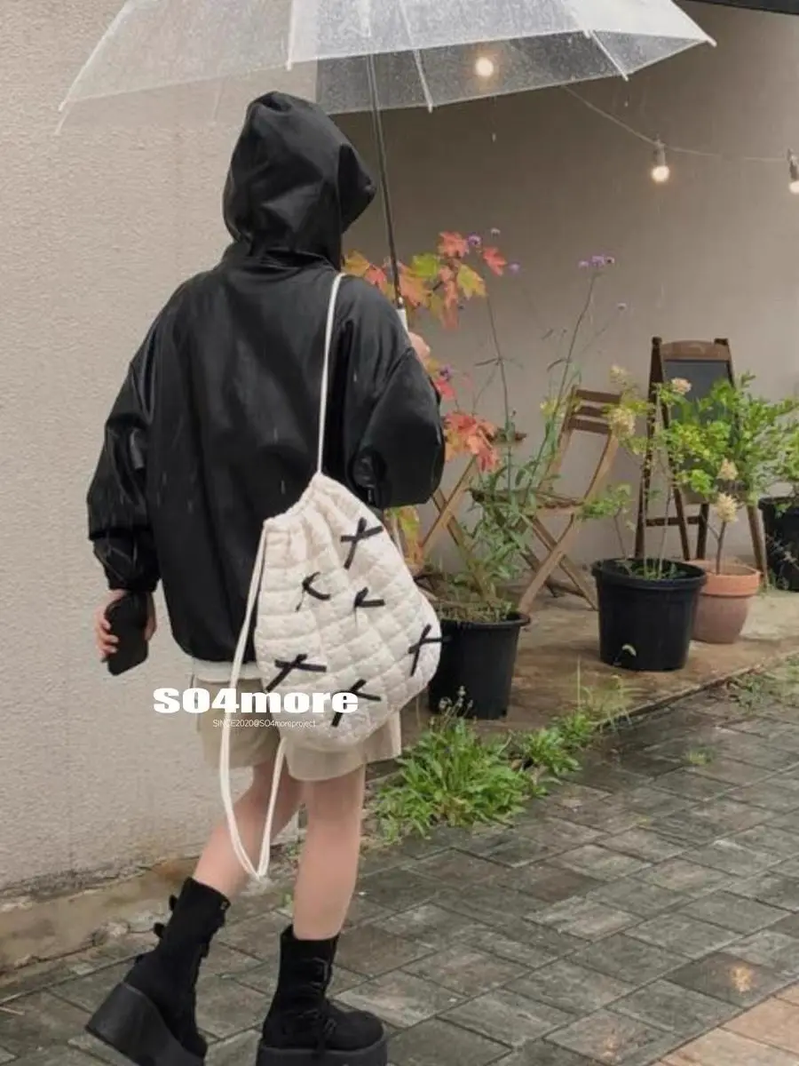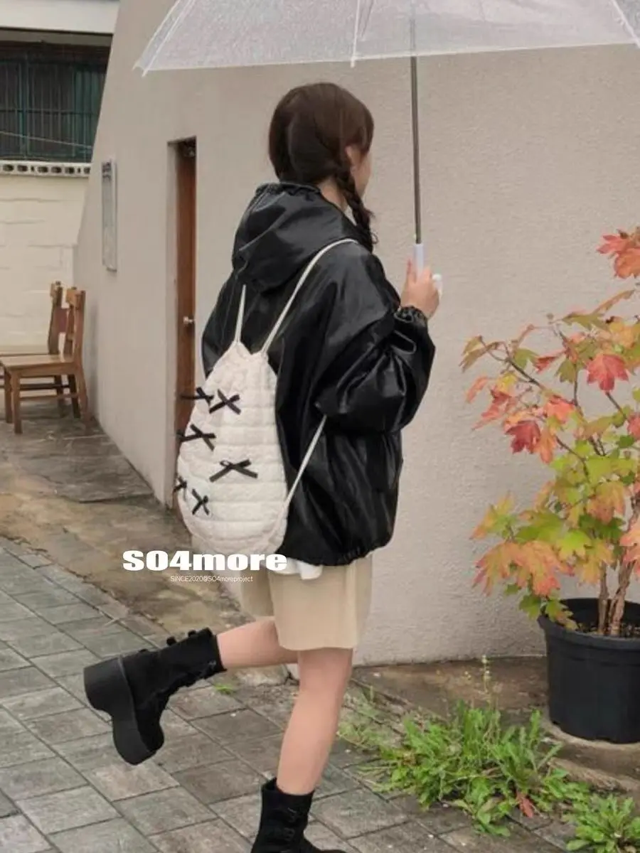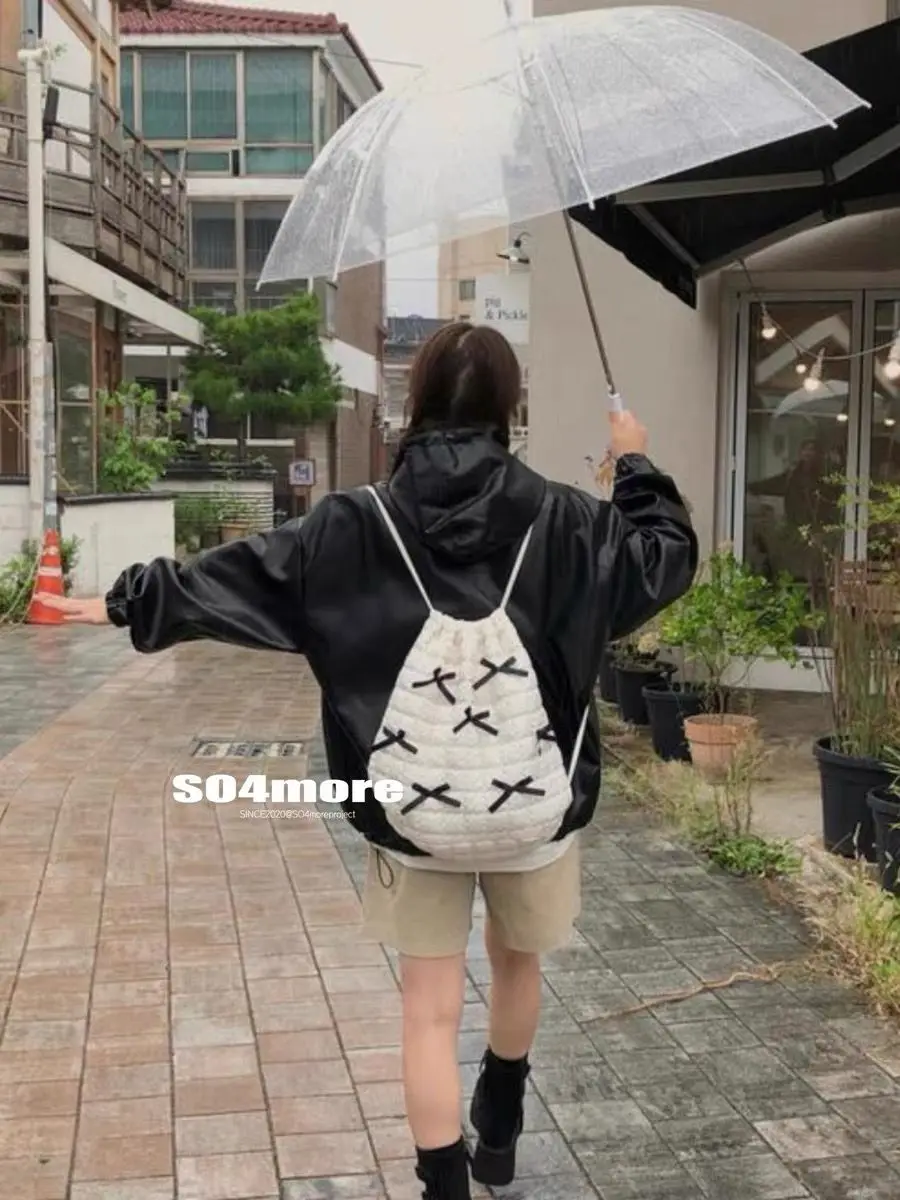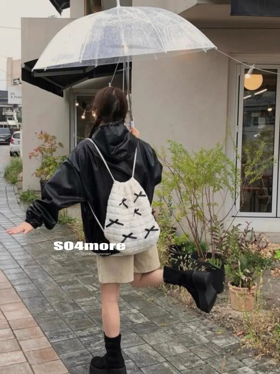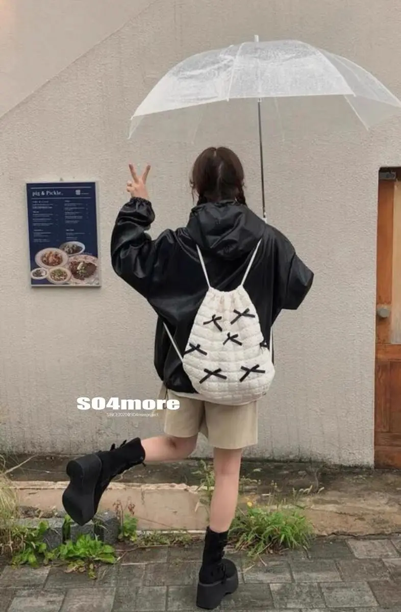 Weiyinxing Black Bow Design Cotton Drawstring Backpack 2024 Winter Korean Fashion Y2K Big Soft Backpacks Lady Back Pack