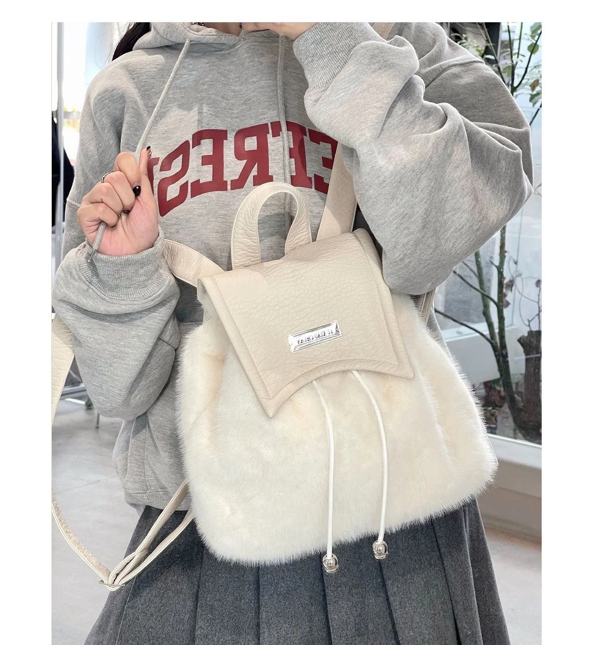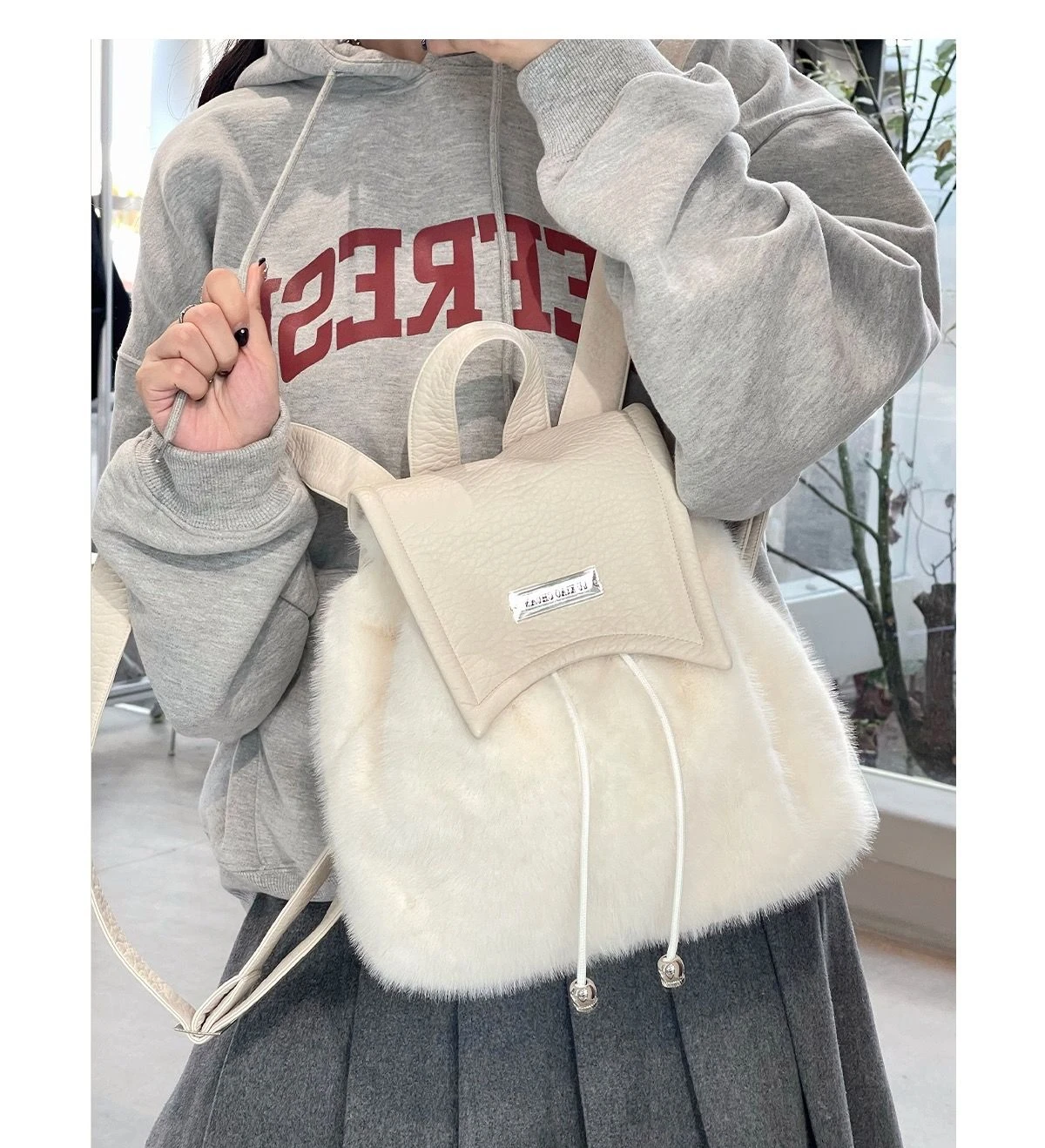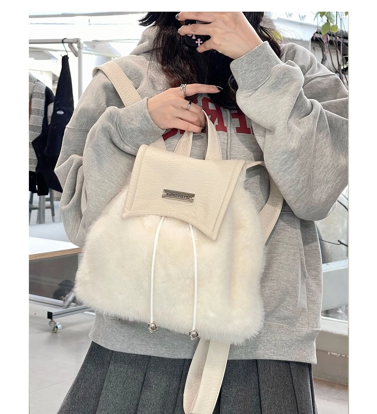 Weiyinxing Sweet Cute Soft Plush Shoulder Bag White Harajuku Style Drawstring Backpack New Large Capacity Elegant Literary Handbag