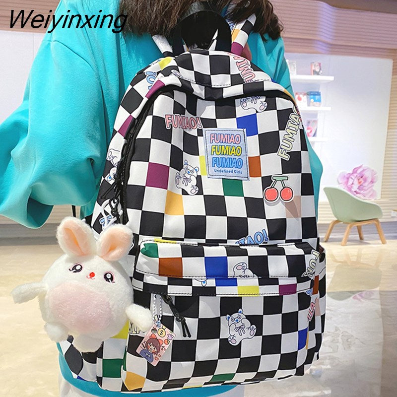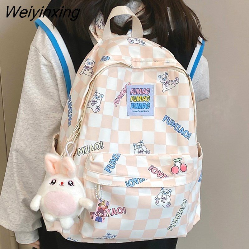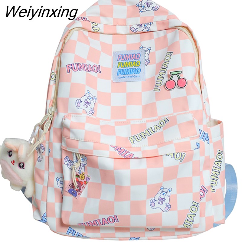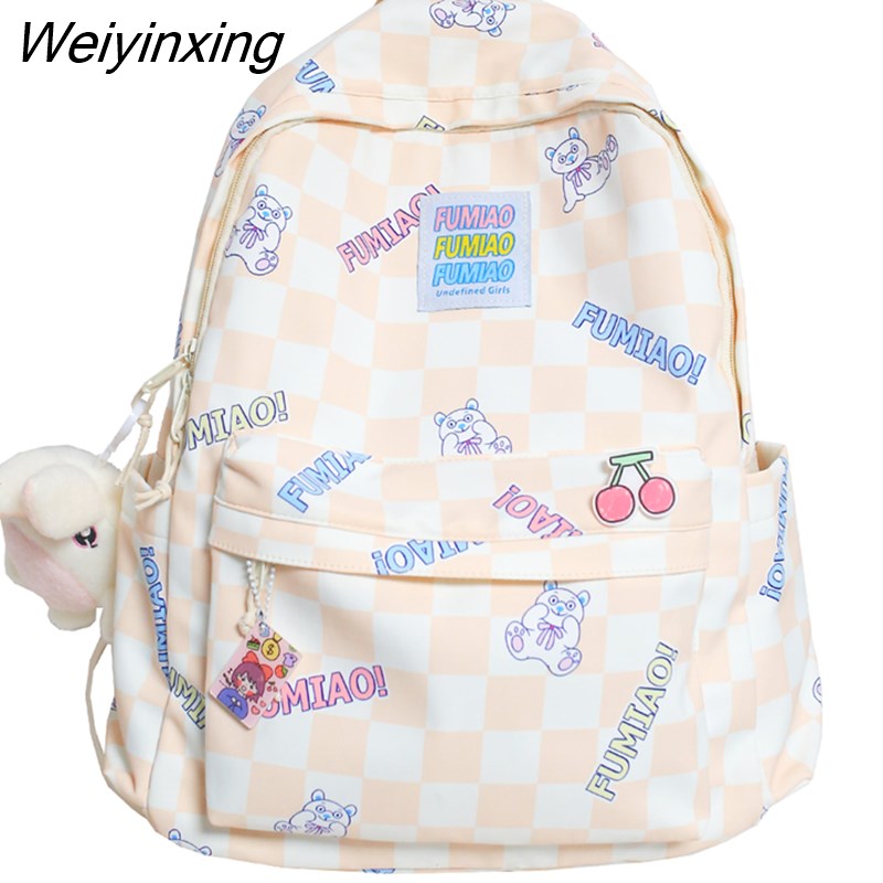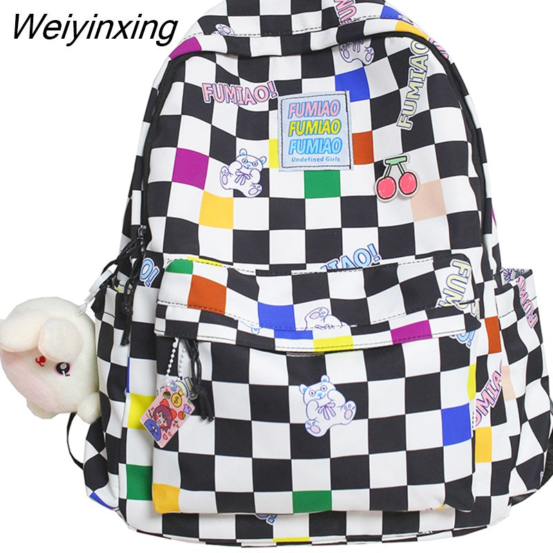 Weiyinxing Women Laptop Plaid College Bag Cute Cartoon Girl Travel Backpacks Nylon Fashion Lattice Ladies Kawaii Backpack Female School Bag