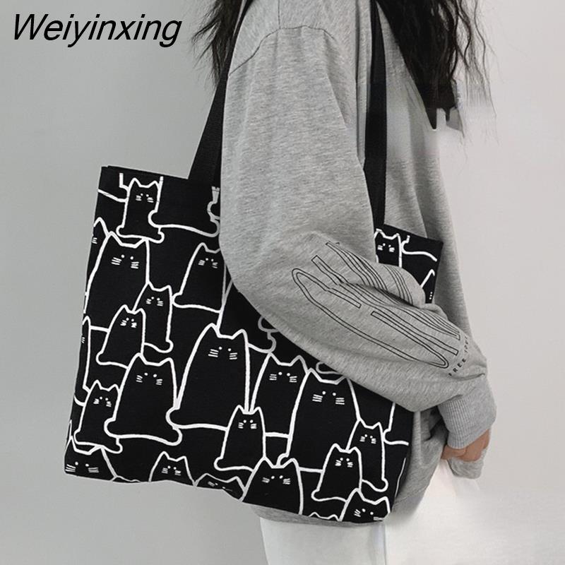 Weiyinxing Canvas Bags Handbag for Women Shopper Tote Bag Fashion Designer Bag Japanese Style Cartoon Cute Cats Small Eco Shoulder Bag