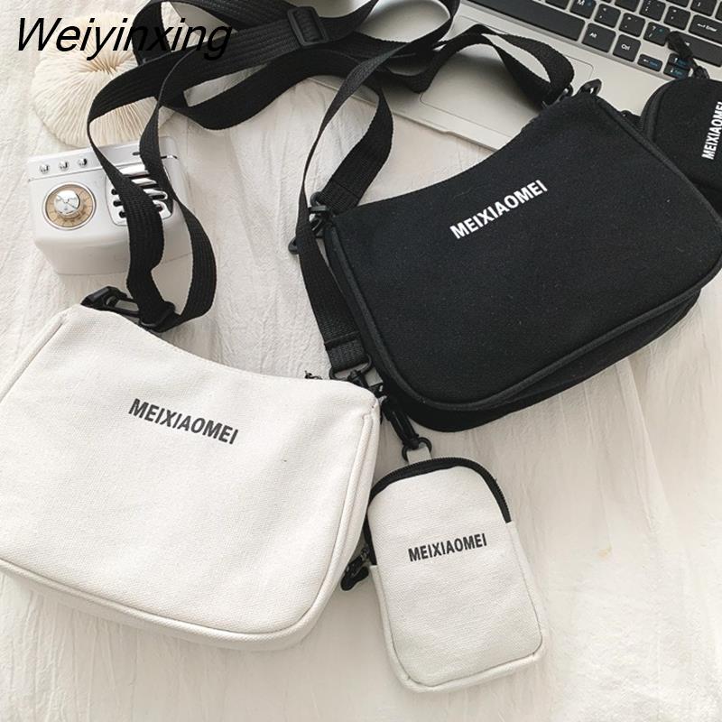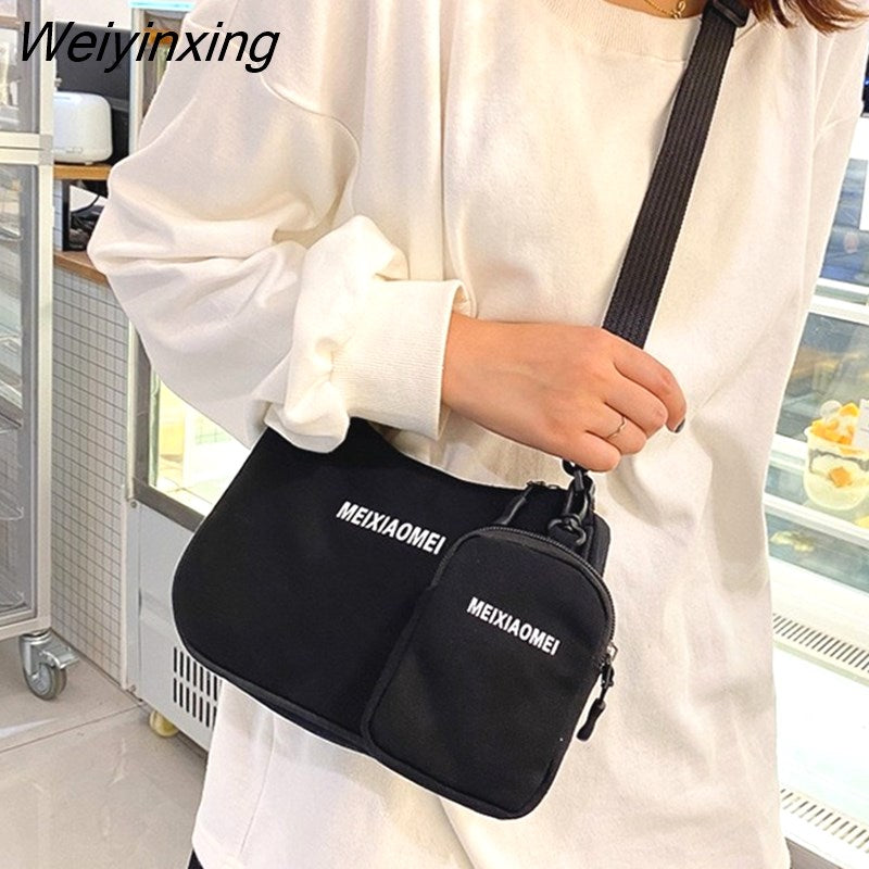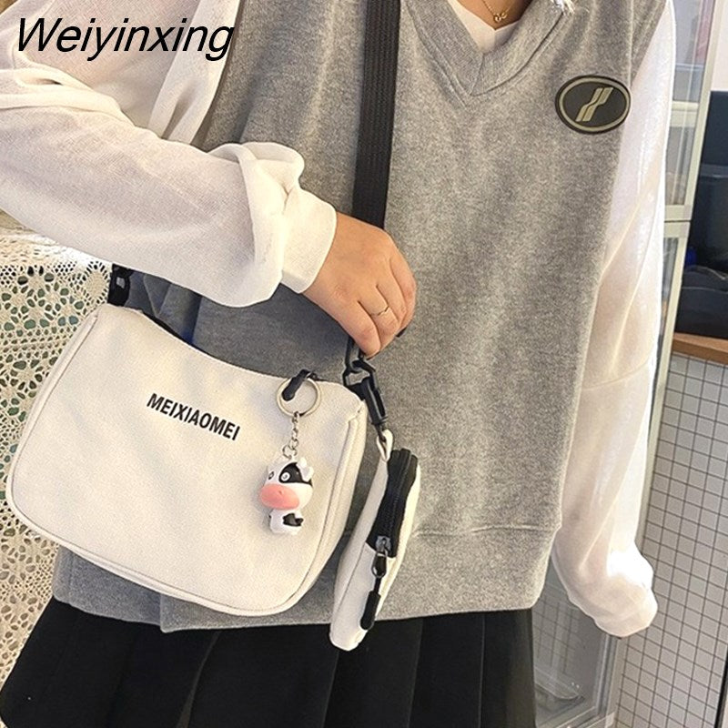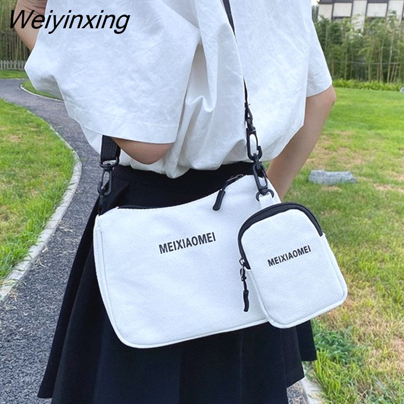 Weiyinxing Canvas Solid Color Letter Shoulder Bags with Mini Purse Pendant Women Bags Casual Small Crossbody Bags 2pcs Composite