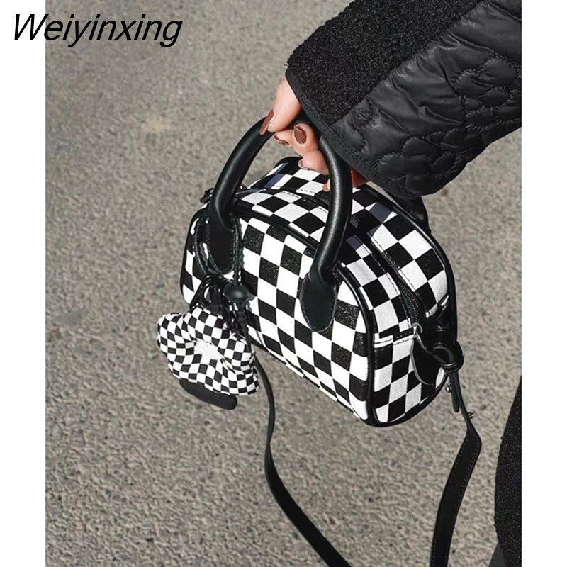 Weiyinxing Checkerboard Black and White Boston Bag Mini Cute Flower Pendant High Capacity Handbag Messenger Bag Purses Handbags