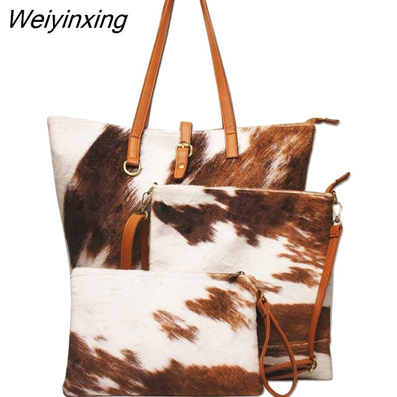 Weiyinxing FASHION Velvet Tote Bags for Women 3 Pieces Set Large Capacity Purses and Handbags Cow Printing Winter Shoulder Bags