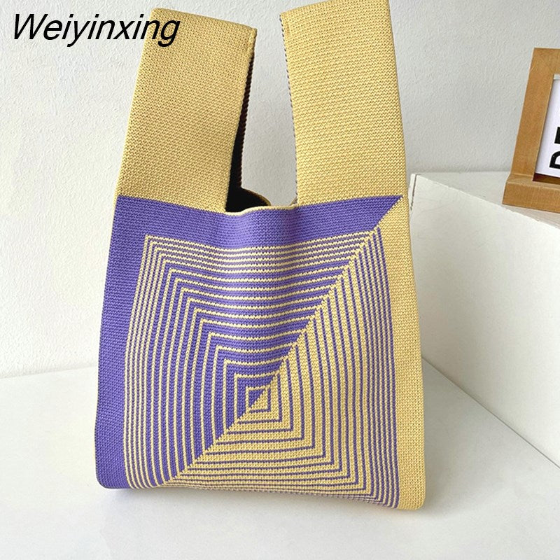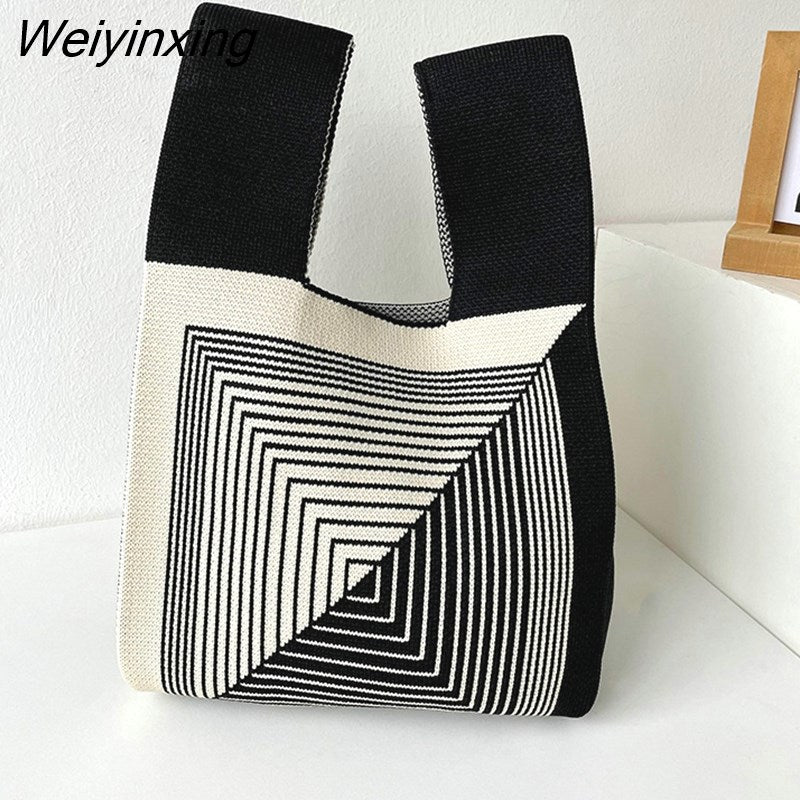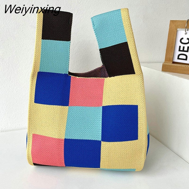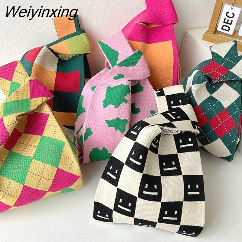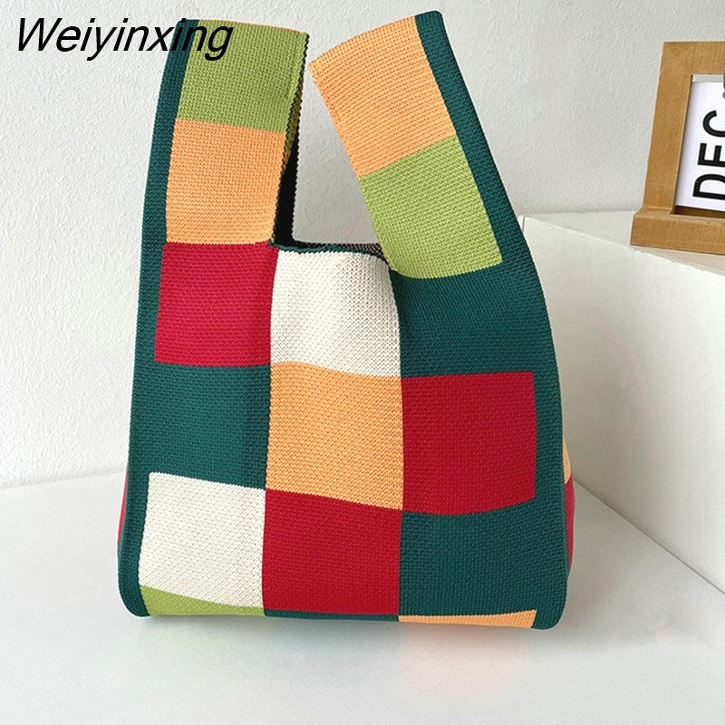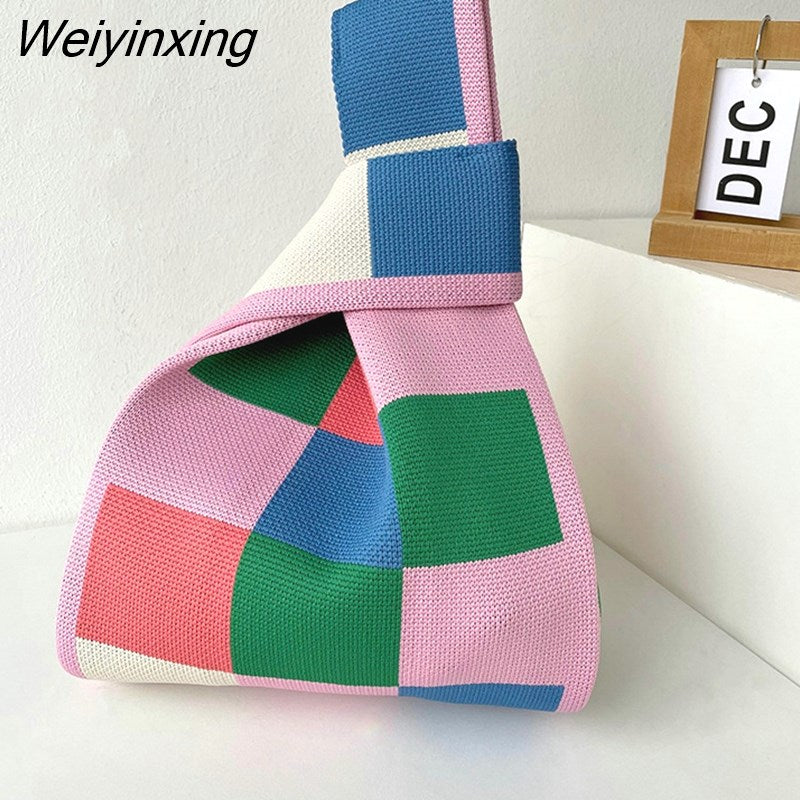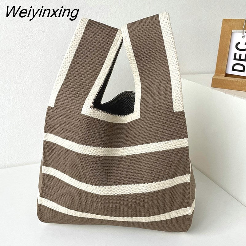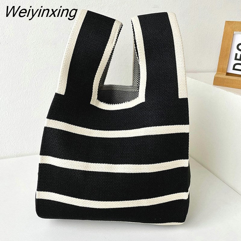 Weiyinxing Handmade Knit Handbag Women Japanese Wrist Knot Bag Wide Stripe Plaid Tote Bag Students Mini Reusable Shopping Bags