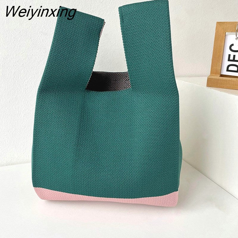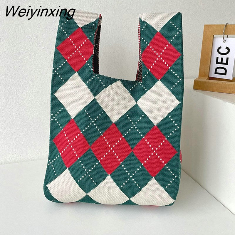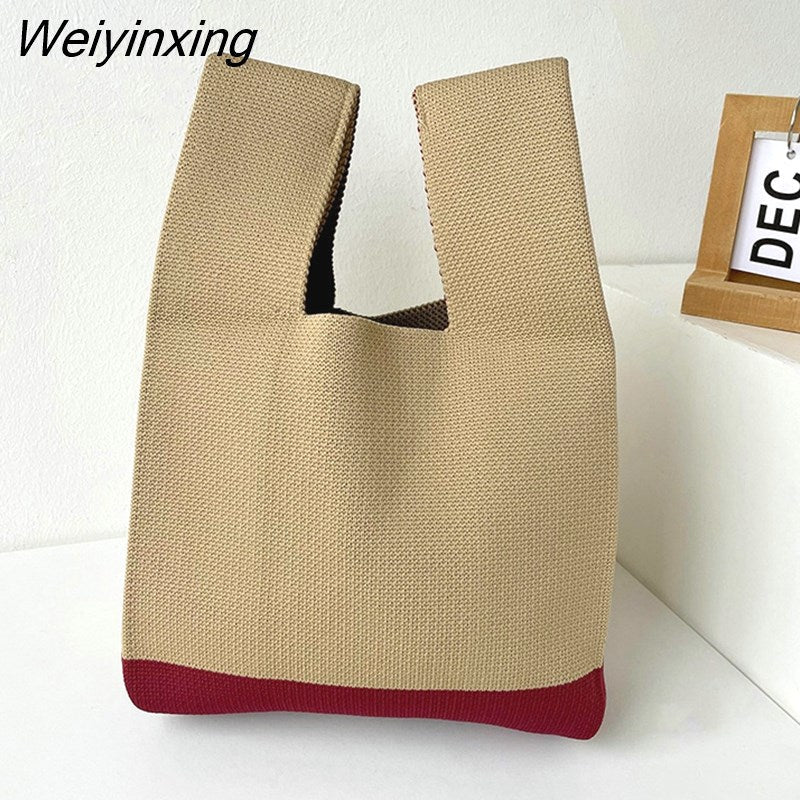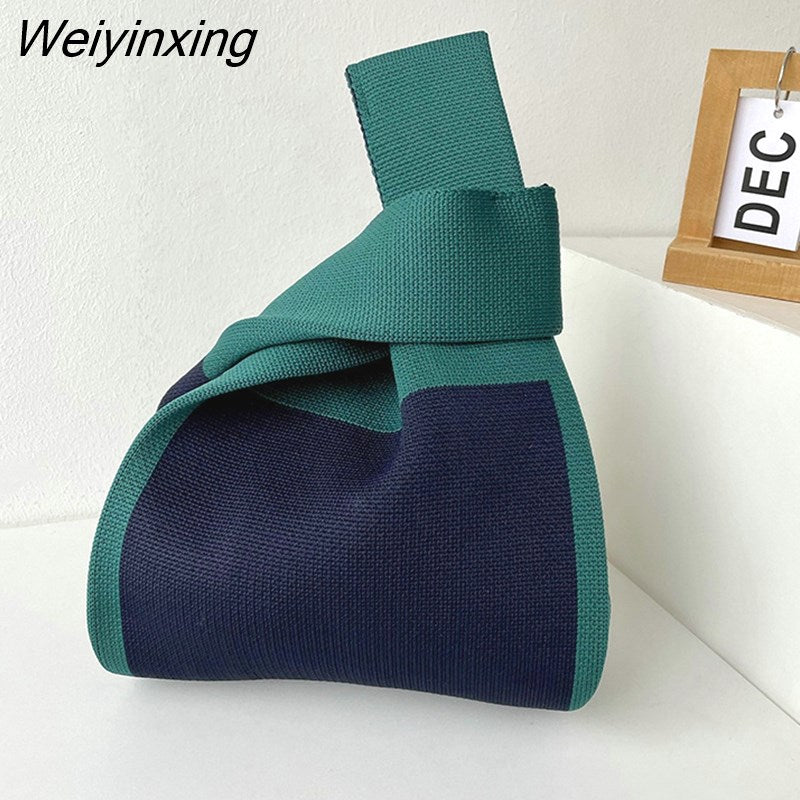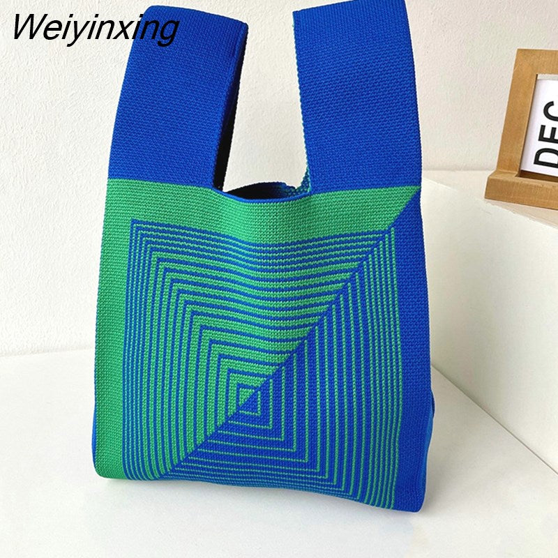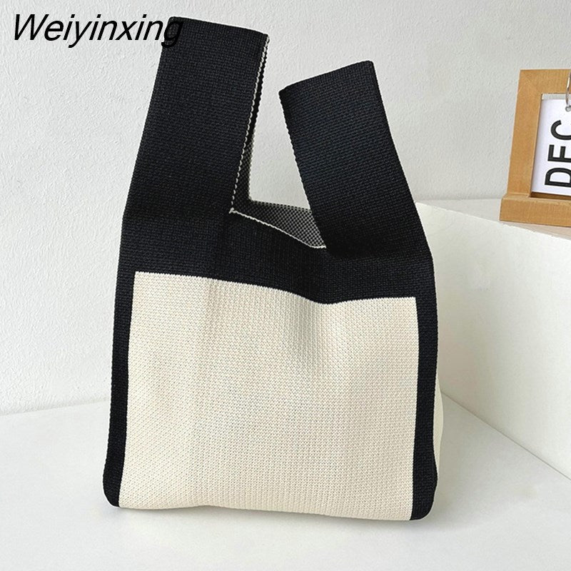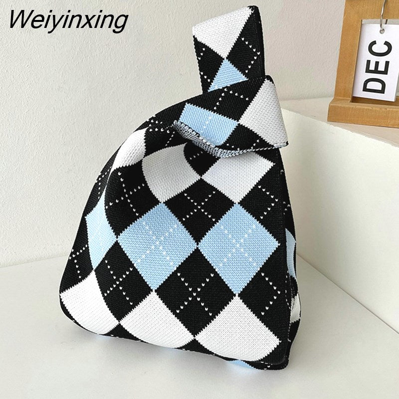 Weiyinxing Handmade Knit Handbag Women Japanese Wrist Knot Bag Wide Stripe Plaid Tote Bag Students Mini Reusable Shopping Bags