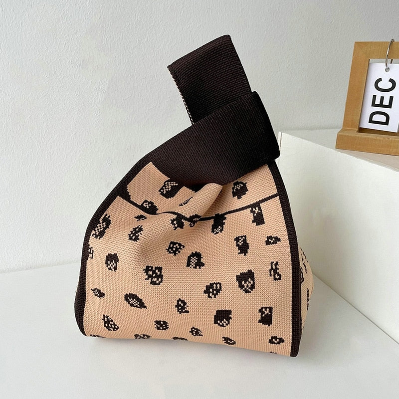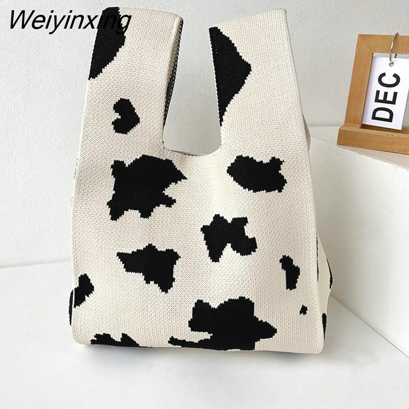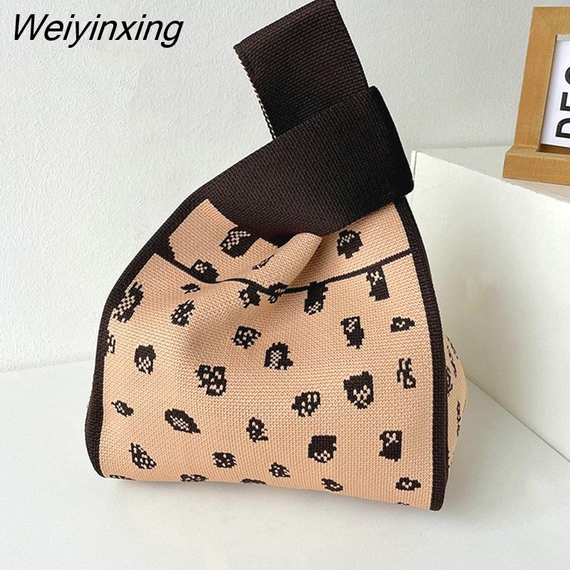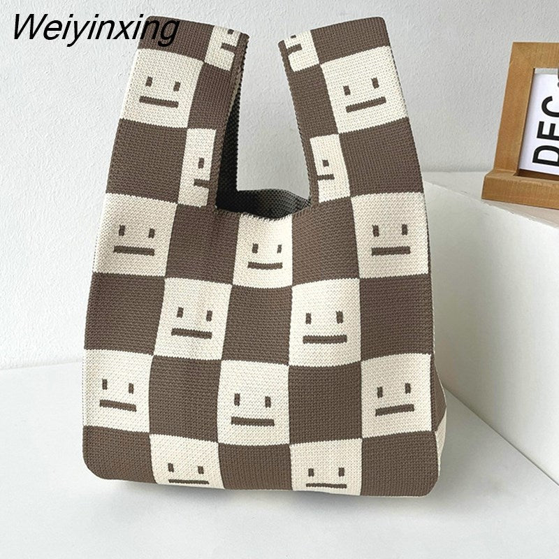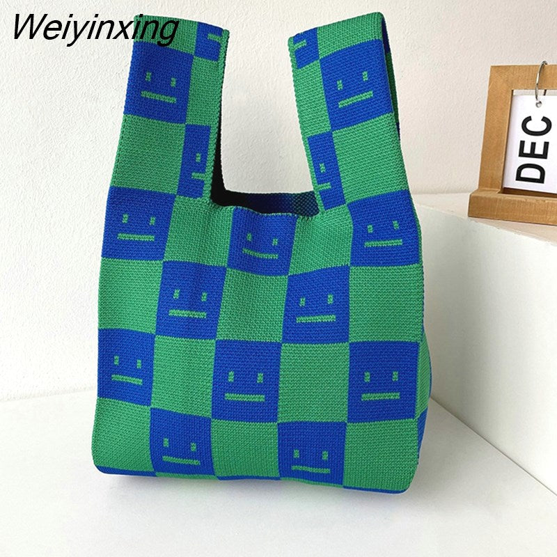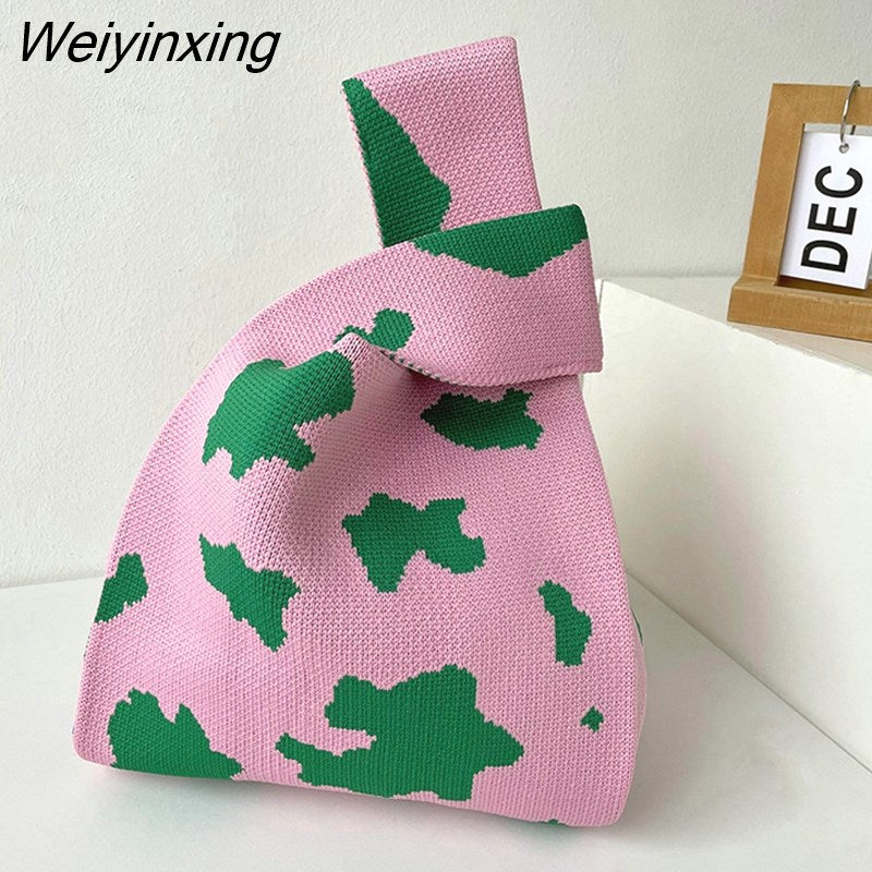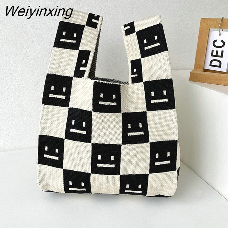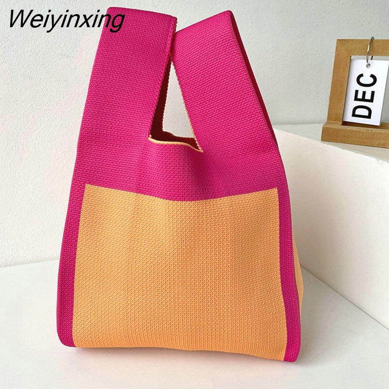 Weiyinxing Handmade Knit Handbag Women Japanese Wrist Knot Bag Wide Stripe Plaid Tote Bag Students Mini Reusable Shopping Bags