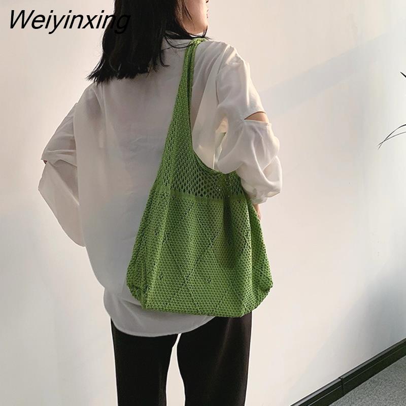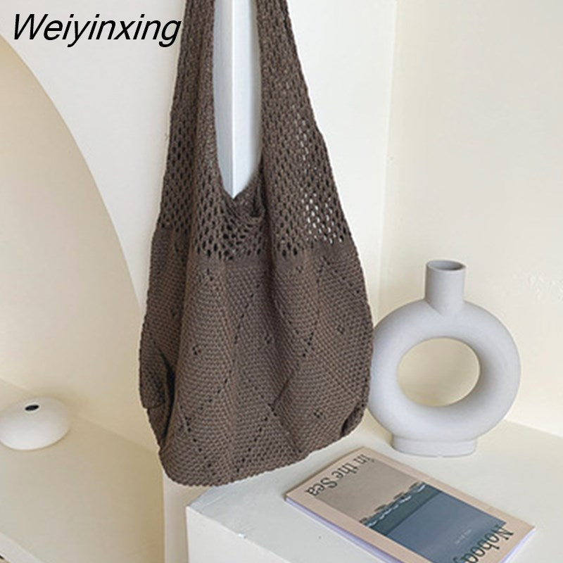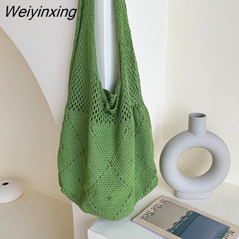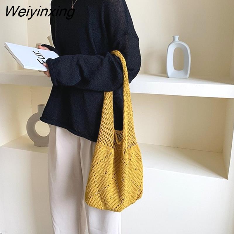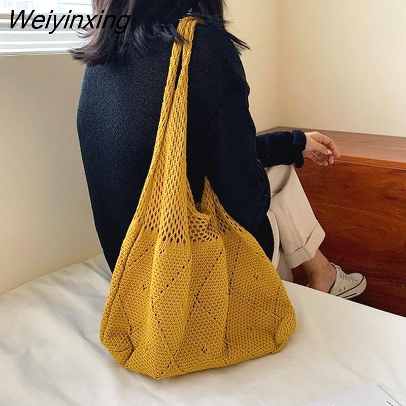 Weiyinxing Lady Retro Chic Crochet Handbag 2023 Korean Fashion Knitted Braid Hollow Black Yellow Top-handle Tote Bag shopper sac
