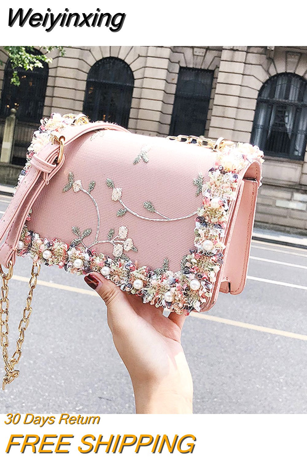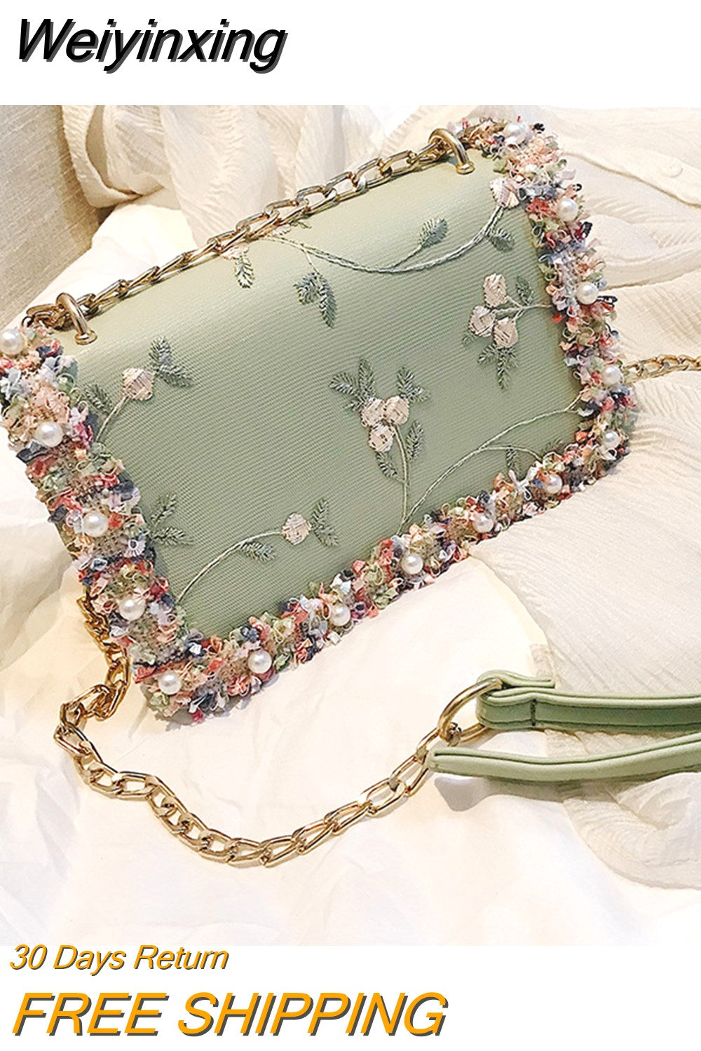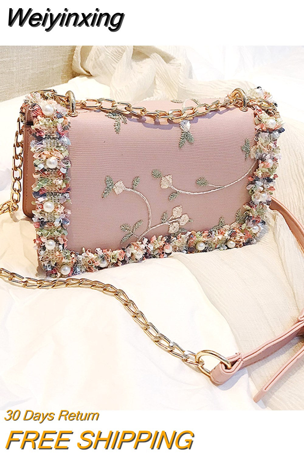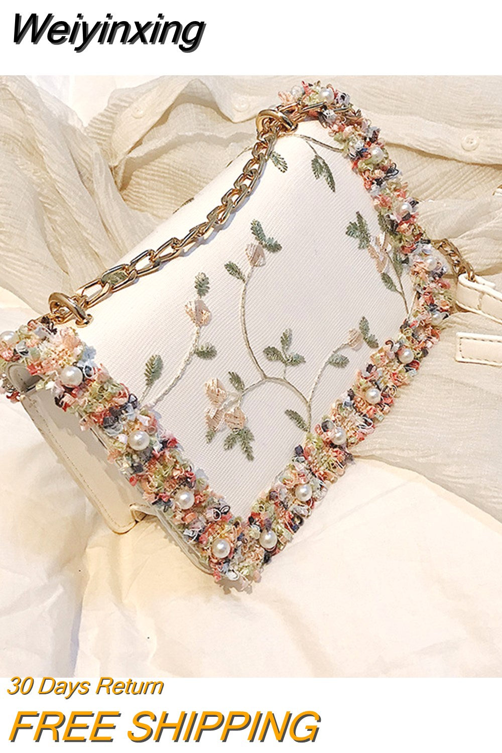 Weiyinxing Retro Crossbody Bags Chain Small Square Bag Embroidery Small Flower Pearl HandBag Women's 2023 Chain One Shoulder Bag