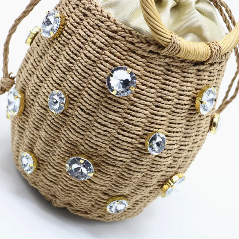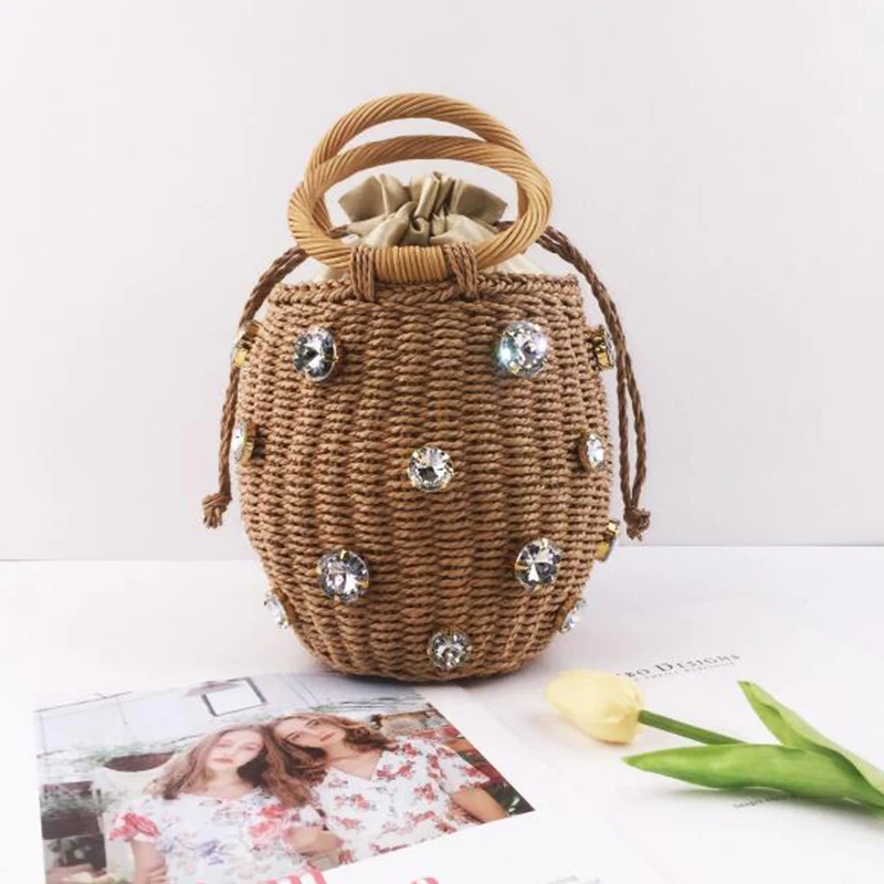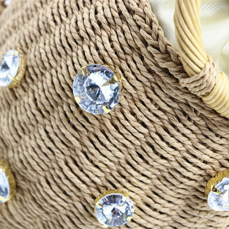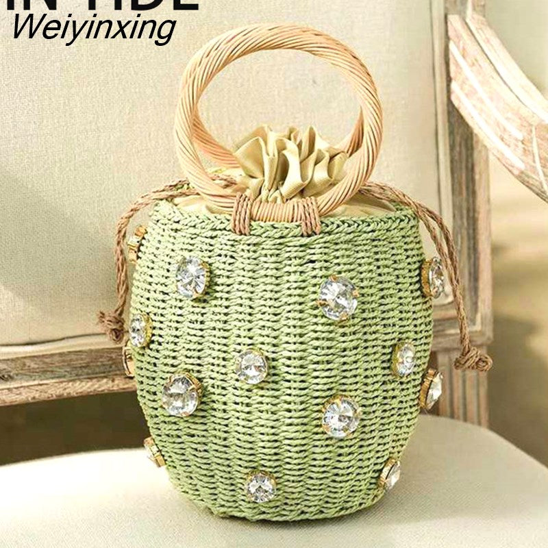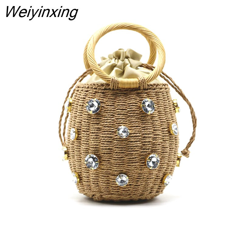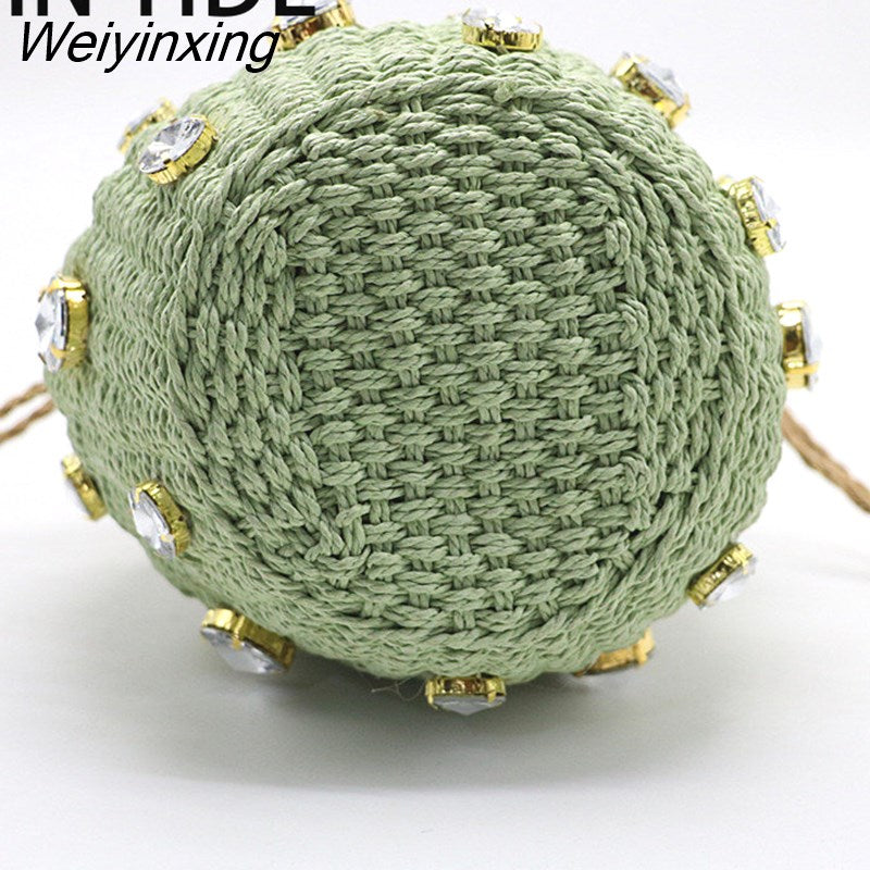 Weiyinxing Round Rattan Handmade diamond Pearl Bag Bohemian Straw Bag Bucket Knitting Shoulder Crossbody Bead Beach Bag Holiday Tote