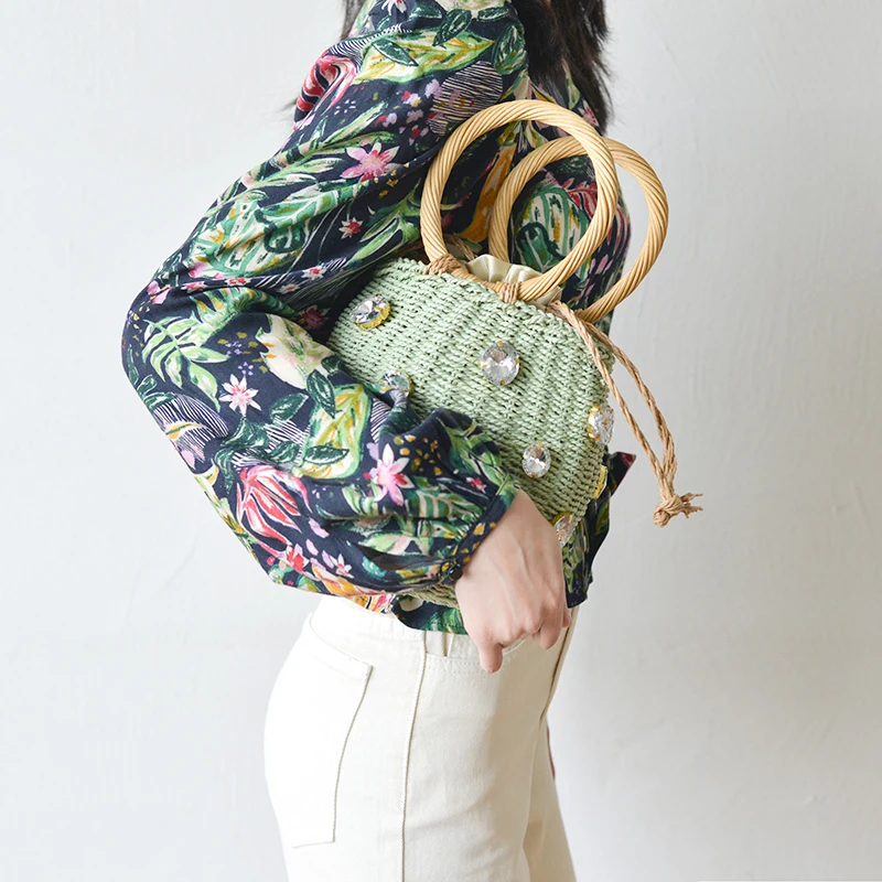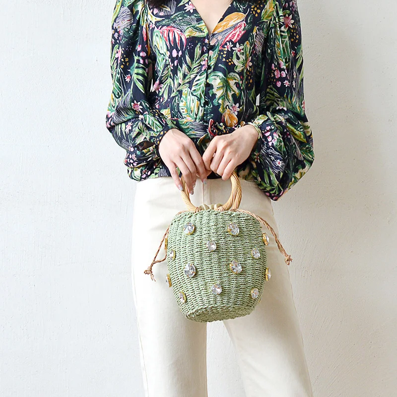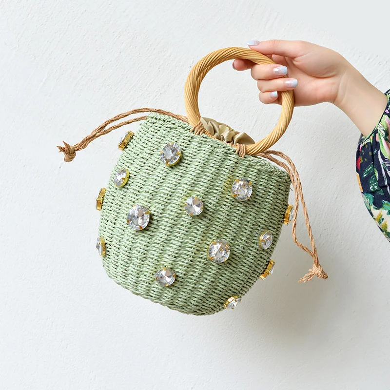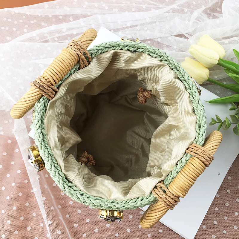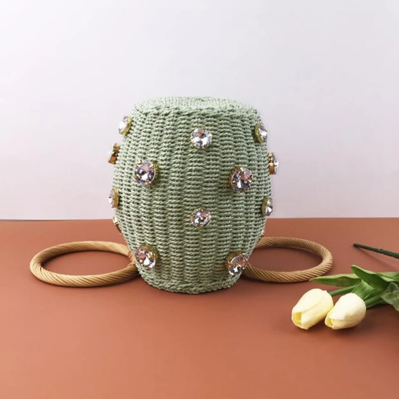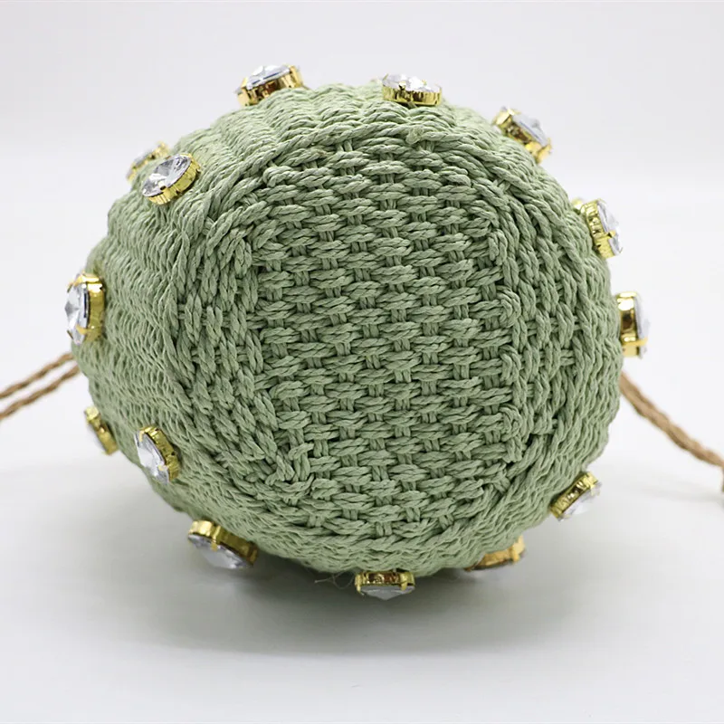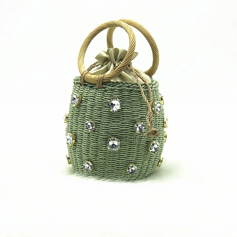 Weiyinxing Round Rattan Handmade diamond Pearl Bag Bohemian Straw Bag Bucket Knitting Shoulder Crossbody Bead Beach Bag Holiday Tote
