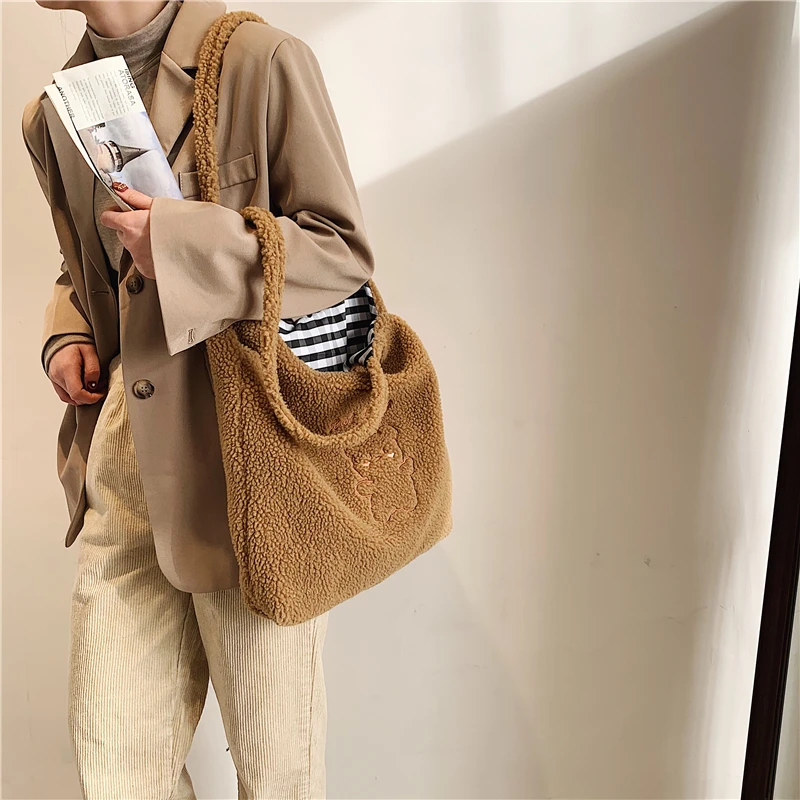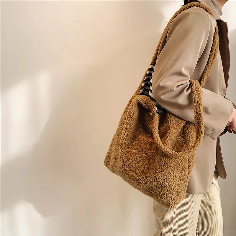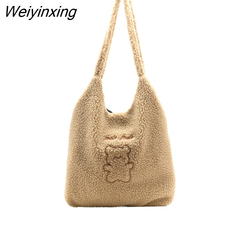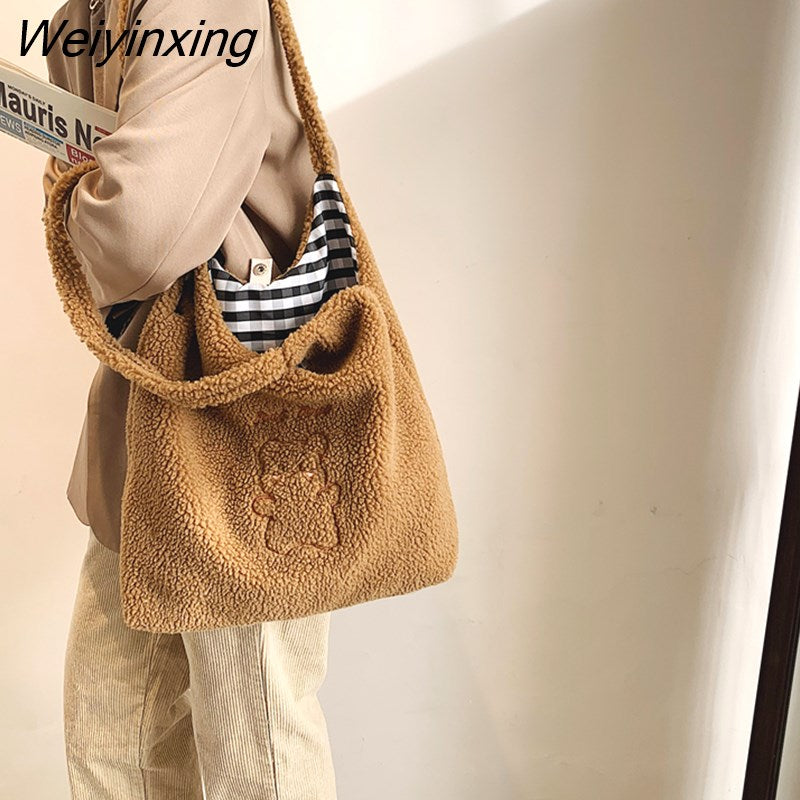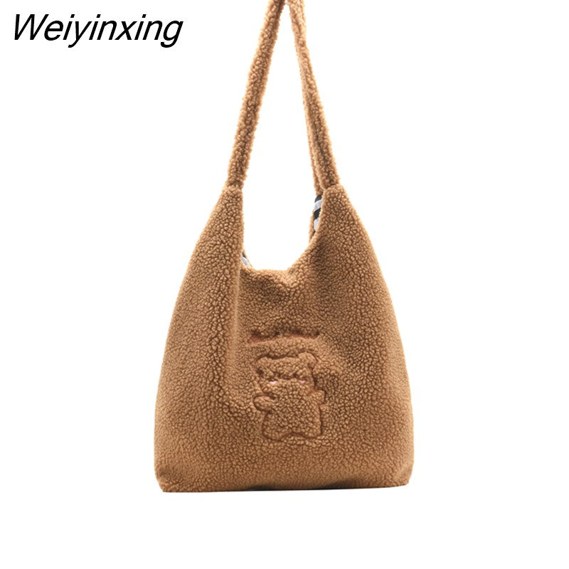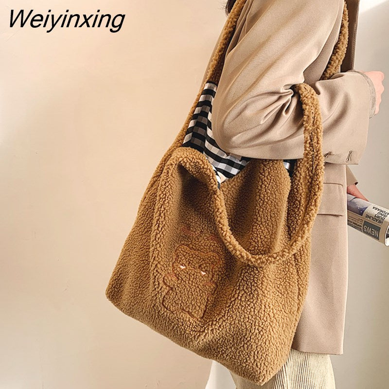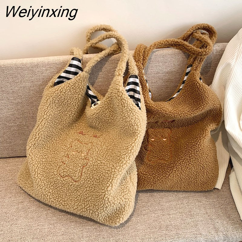 Weiyinxing Shoulder Bags For Women Simple Fashion Warm Fabric Large Capacity Shopping Bag Soft Canvas Tote Ladies Cute Bear Handbags