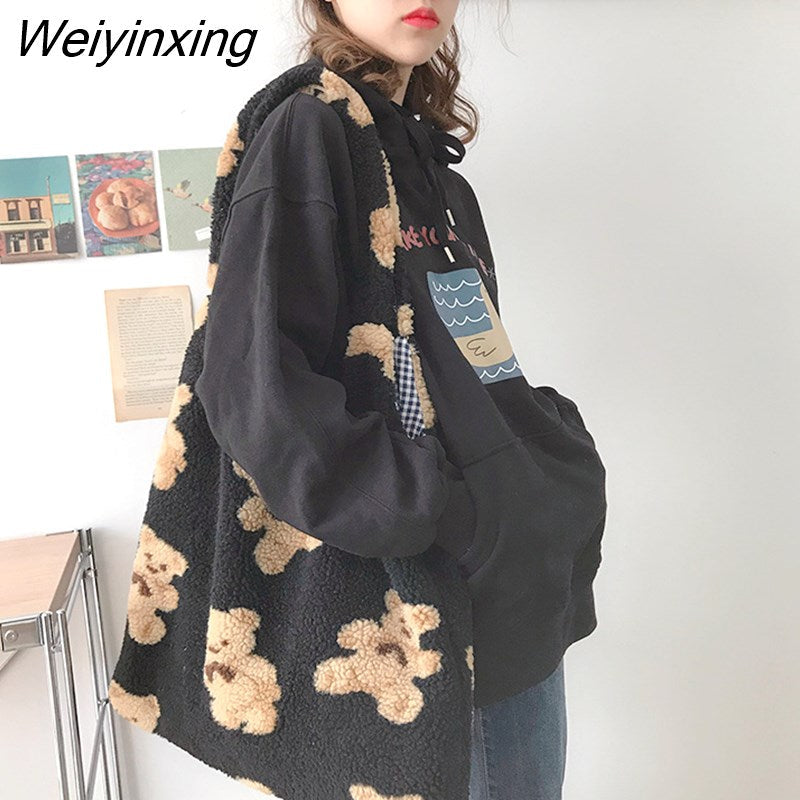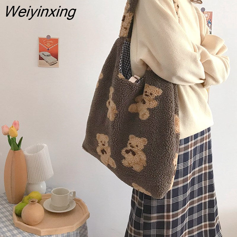 Weiyinxing Women Plush Shoulder Bag Warm Cloth Fabric Handbag Soft Canvas Tote Large Capacity Shopping Bags Cute Bear Book Bags for Ladies