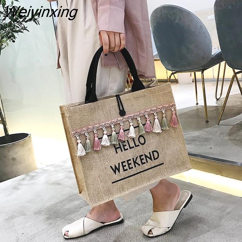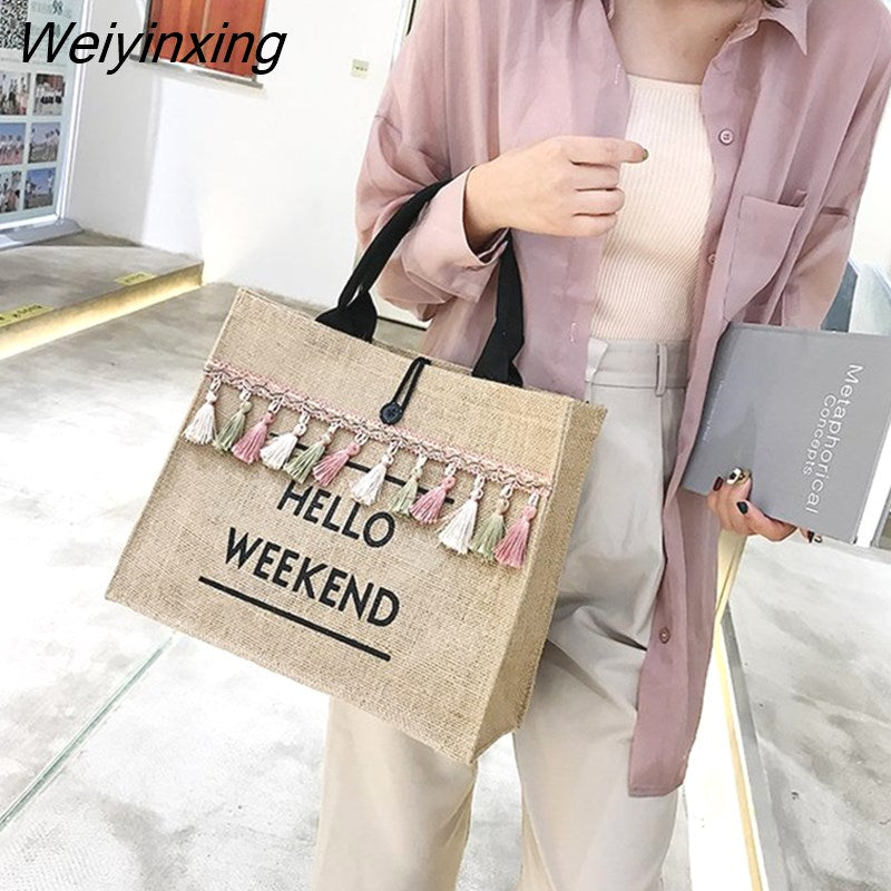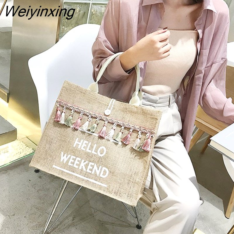 Weiyinxing Women Summer Beach Bags Handbags Large Capacity Lady Tassel Shoulder Bag Big Letter Linen Totes Casual Girls Travel Shopping Bag