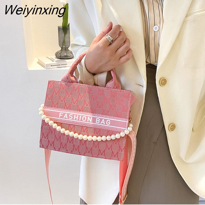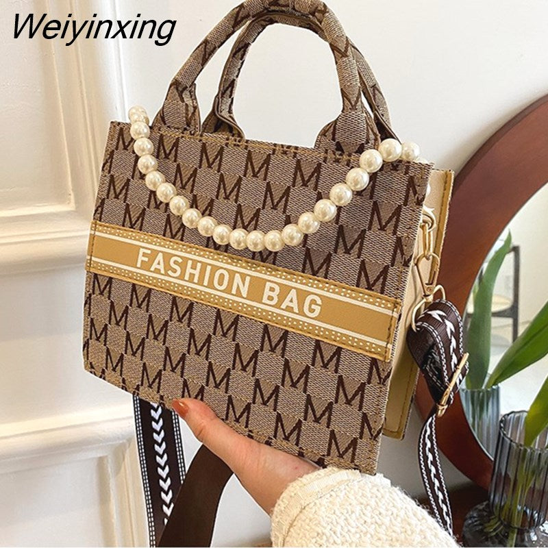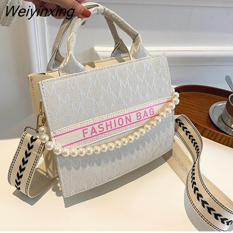 Weiyinxing Women's Square Pearl Chain Bag Large-capacity Tote Bag New Western Style Letter Printing Shoulder Bag Trendy Messenger Bag