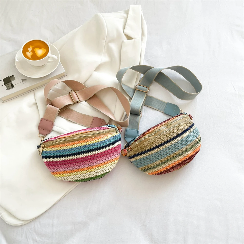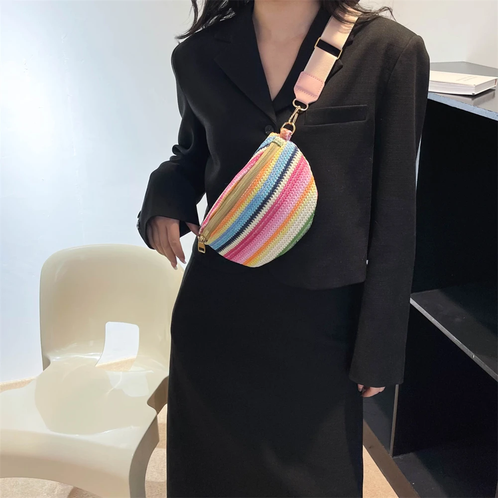 Weiyinxing Bohemian Chest Bags For Women Rainbow Color Striped Knitted Waist Pack Weaving Design Mini Crossbody Saddle Bag Sac A Mai