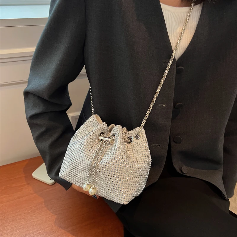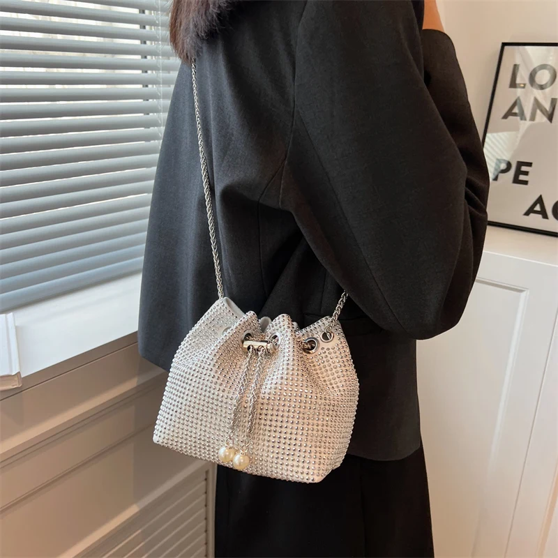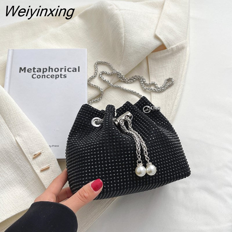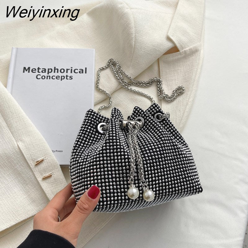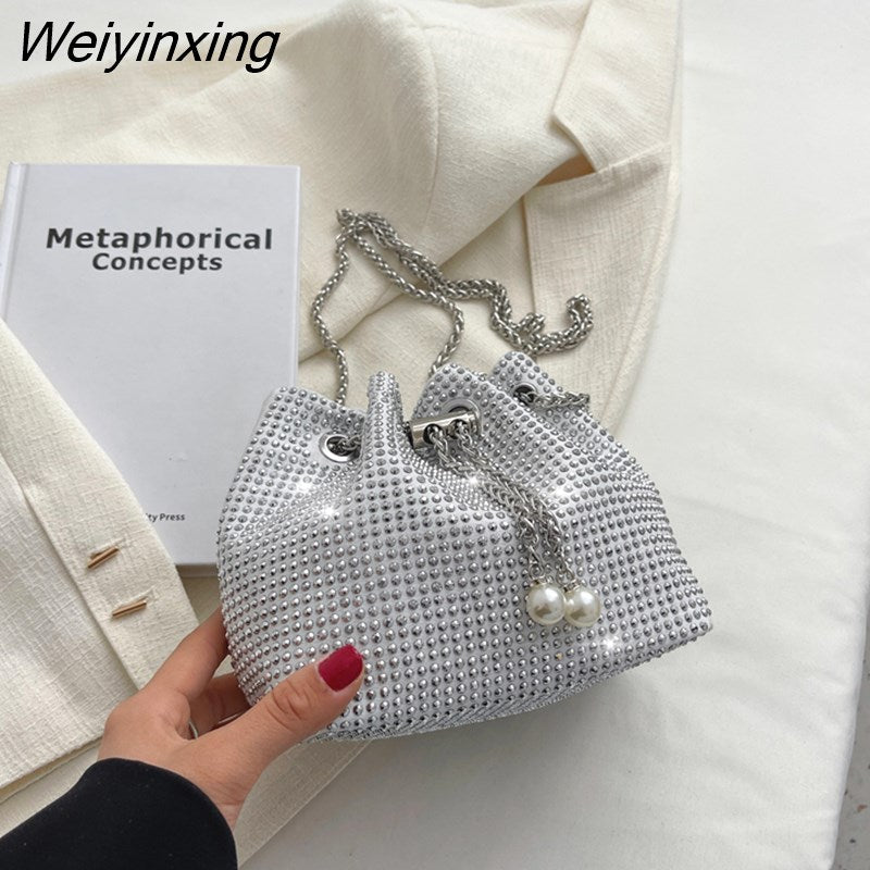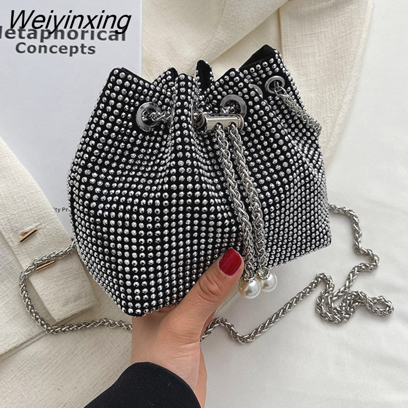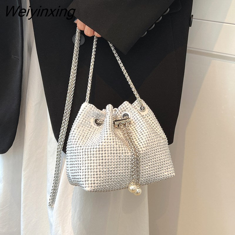 Weiyinxing Diamond Glitter Drawstring Handbags and Purses 2023 Luxury Designer Women's Mini Chain Bucket Shoulder Crossbody Bag