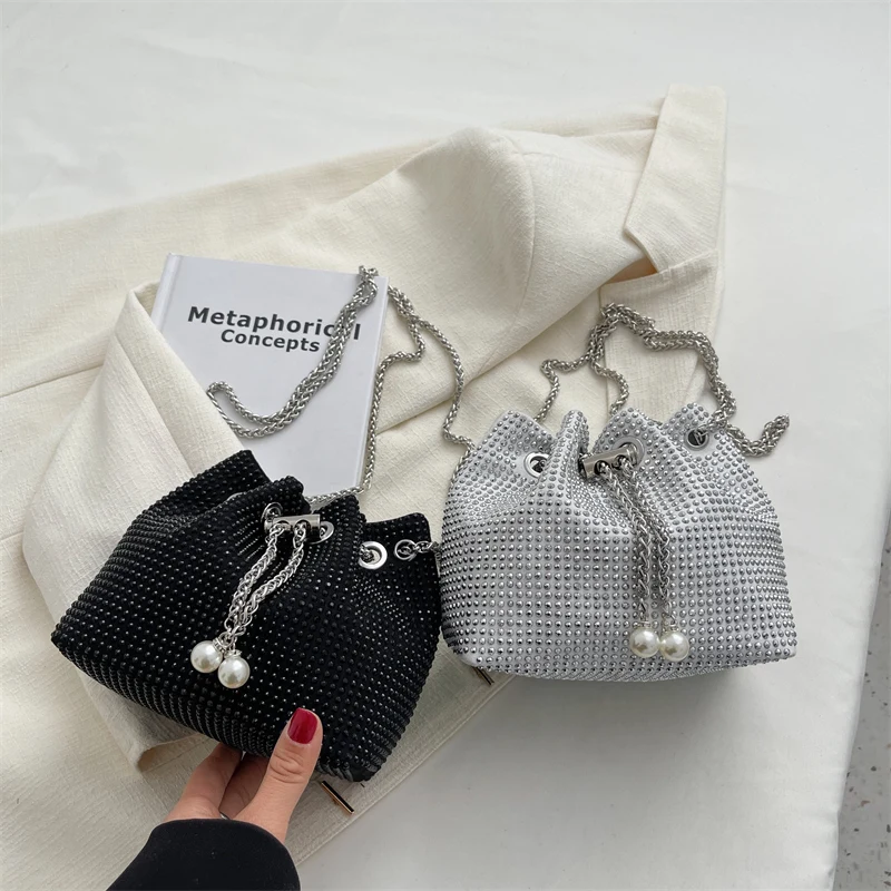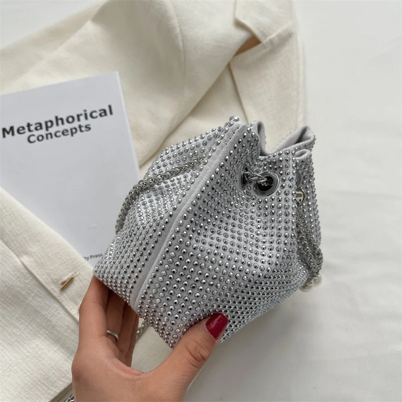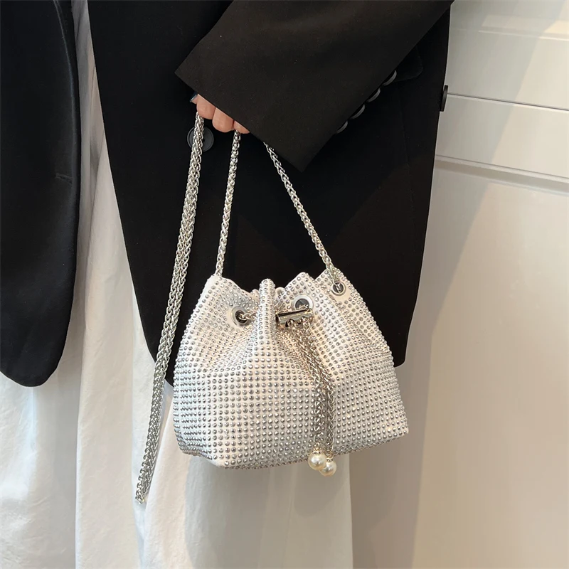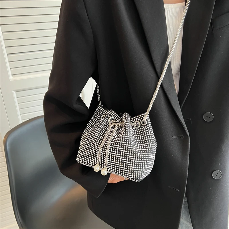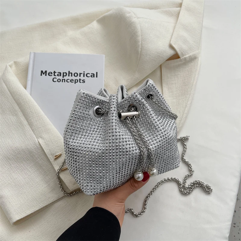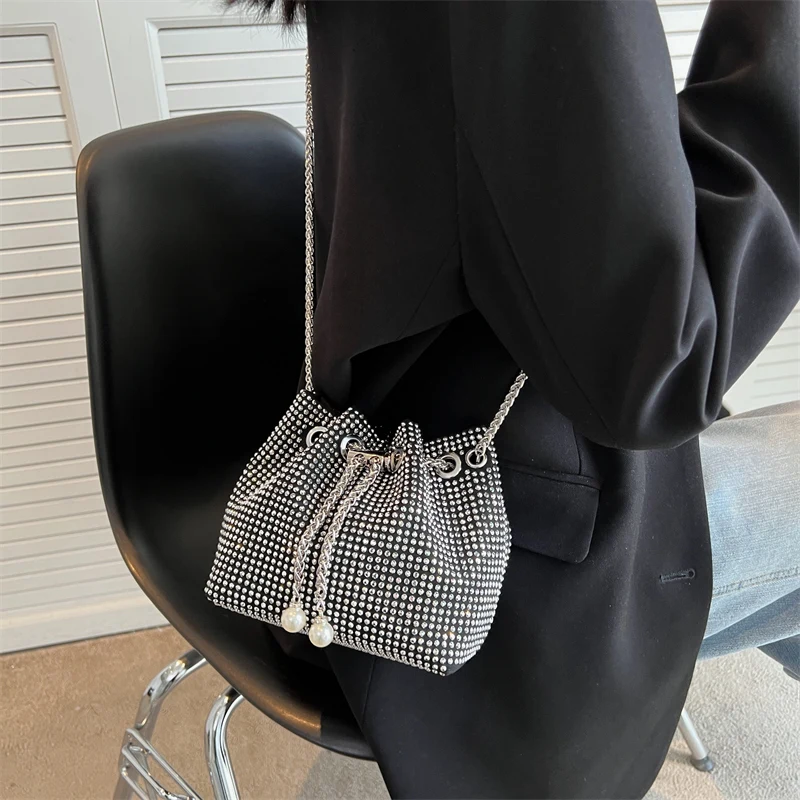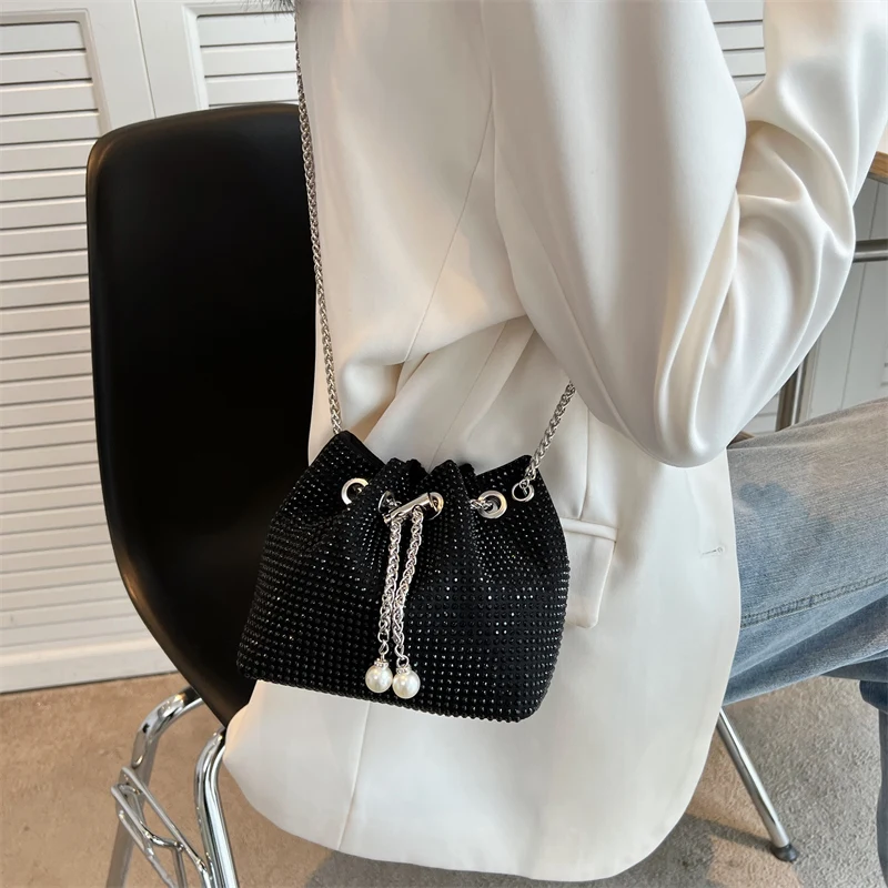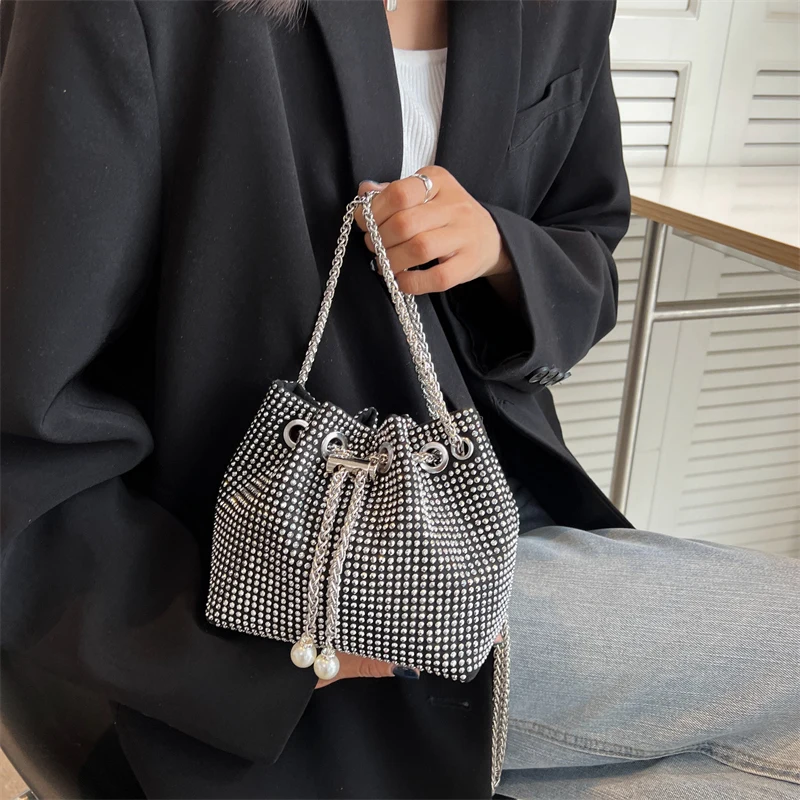 Weiyinxing Diamond Glitter Drawstring Handbags and Purses 2023 Luxury Designer Women's Mini Chain Bucket Shoulder Crossbody Bag
