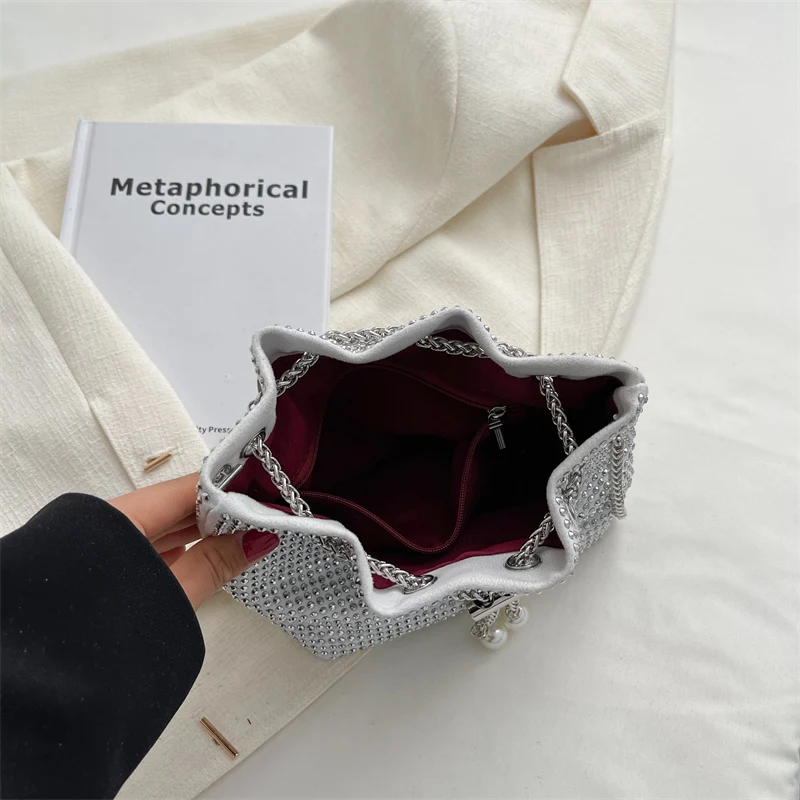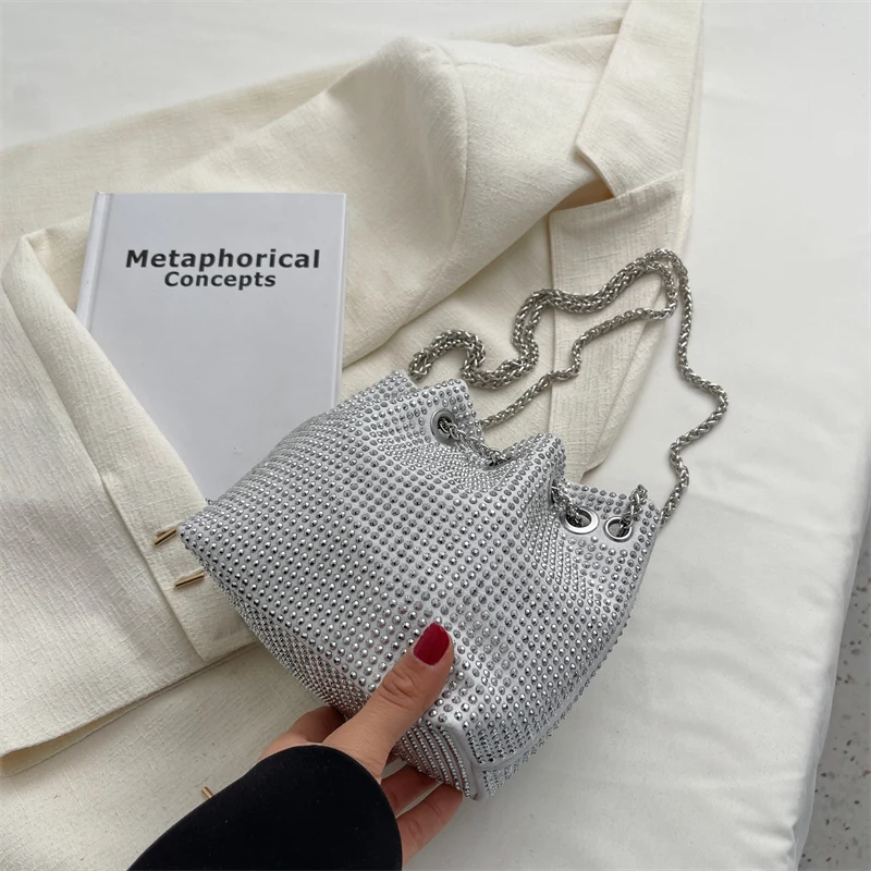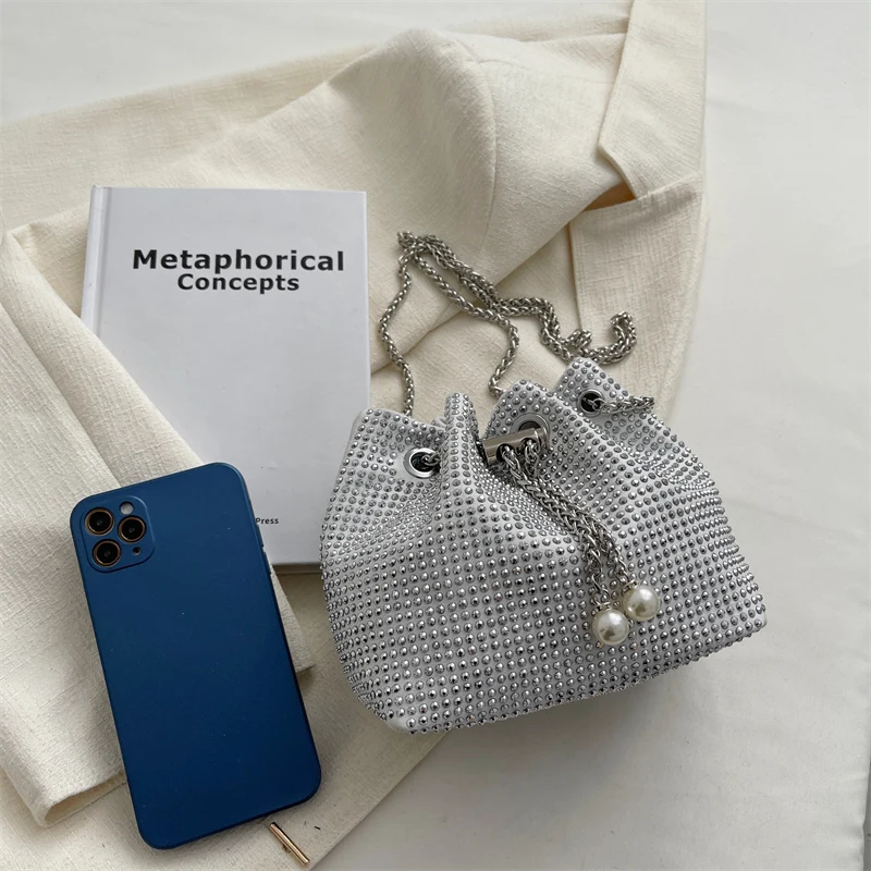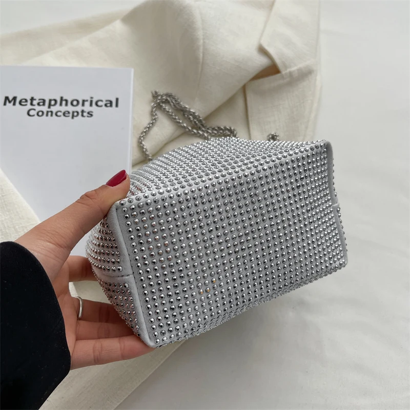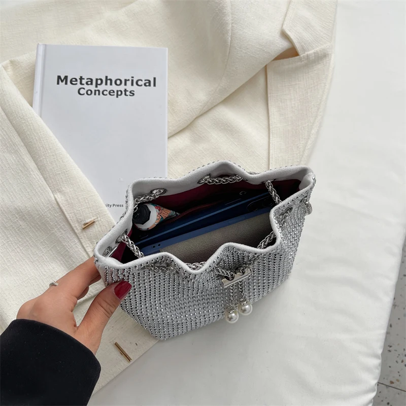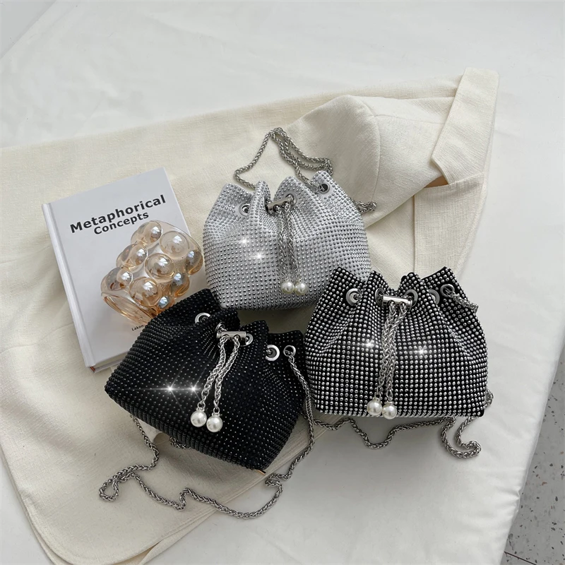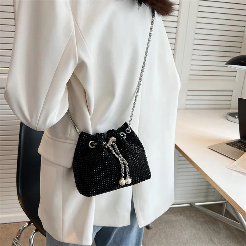 Weiyinxing Diamond Glitter Drawstring Handbags and Purses 2023 Luxury Designer Women's Mini Chain Bucket Shoulder Crossbody Bag