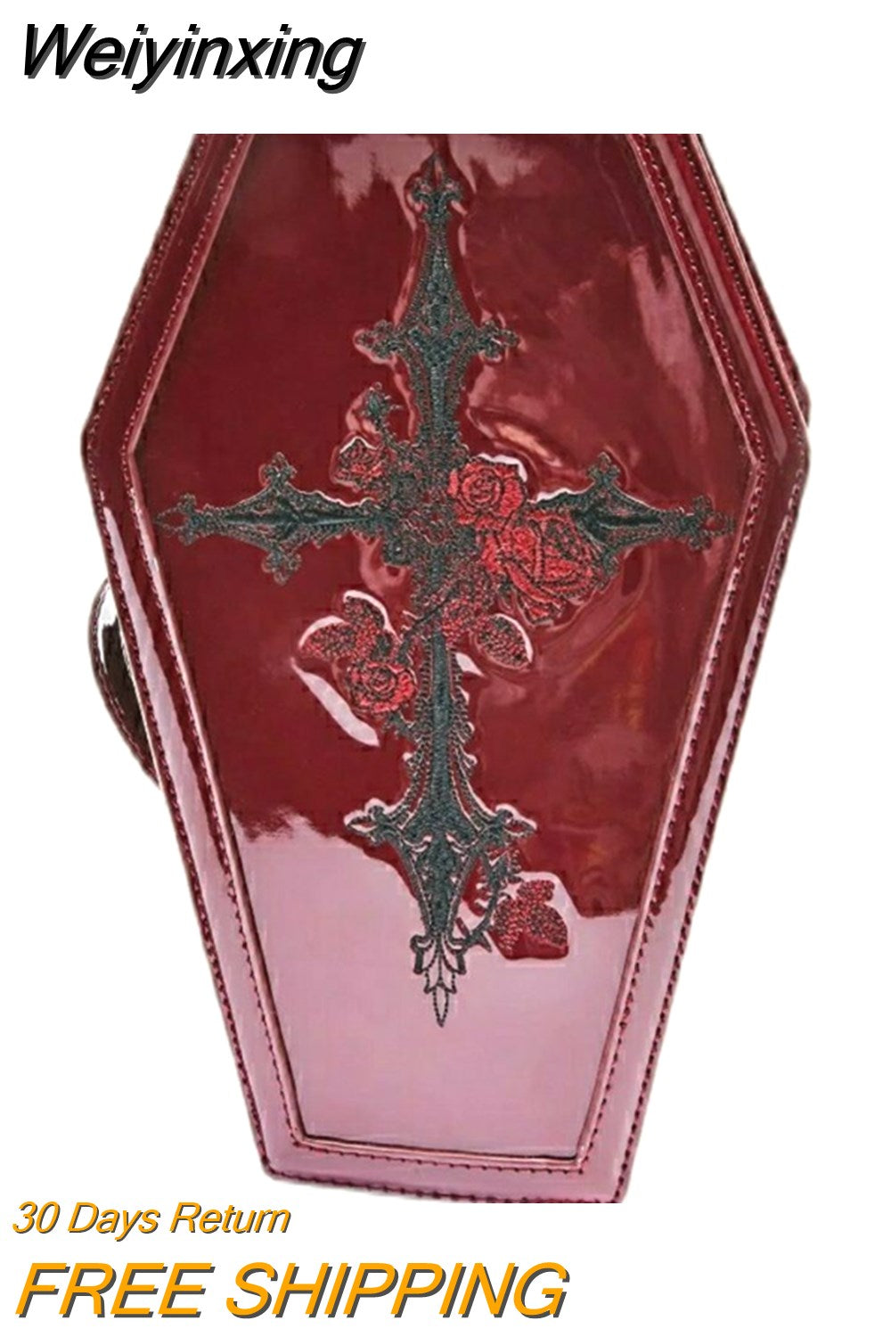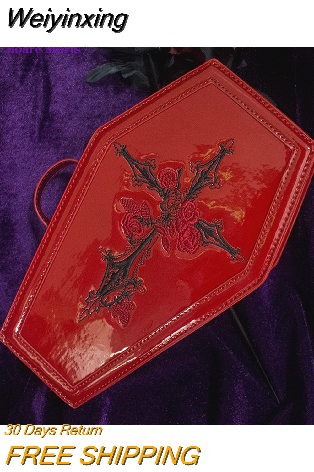Weiyinxing Harajuku Gothic Bags 2023 Punk Coffin Handbags For Women Red Patent Leather Cross Rose Embroidered Cosmetic Bag Suitcase