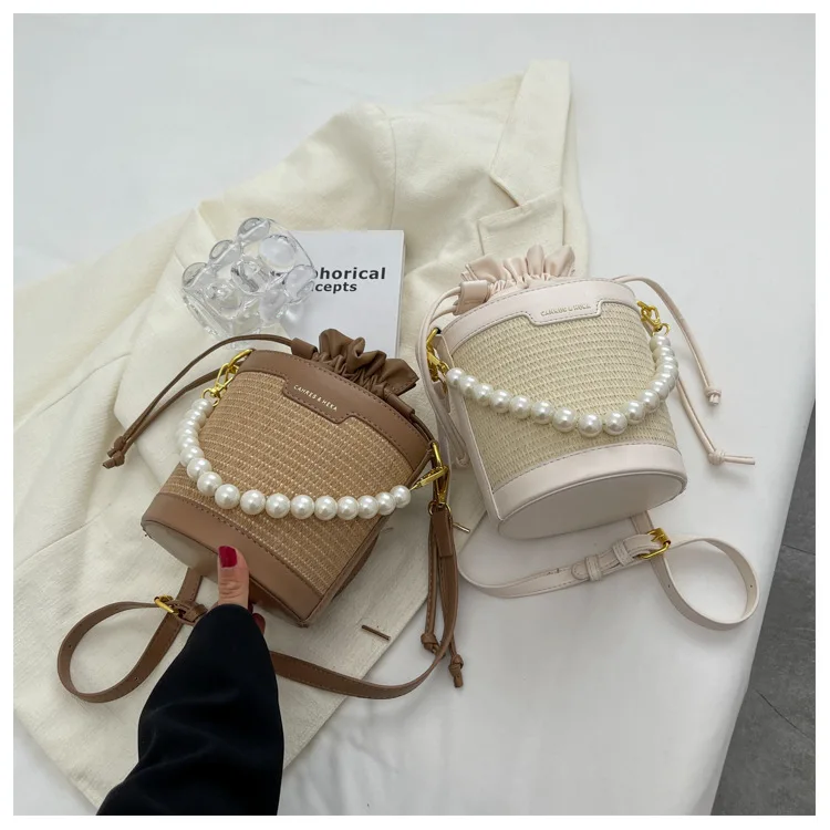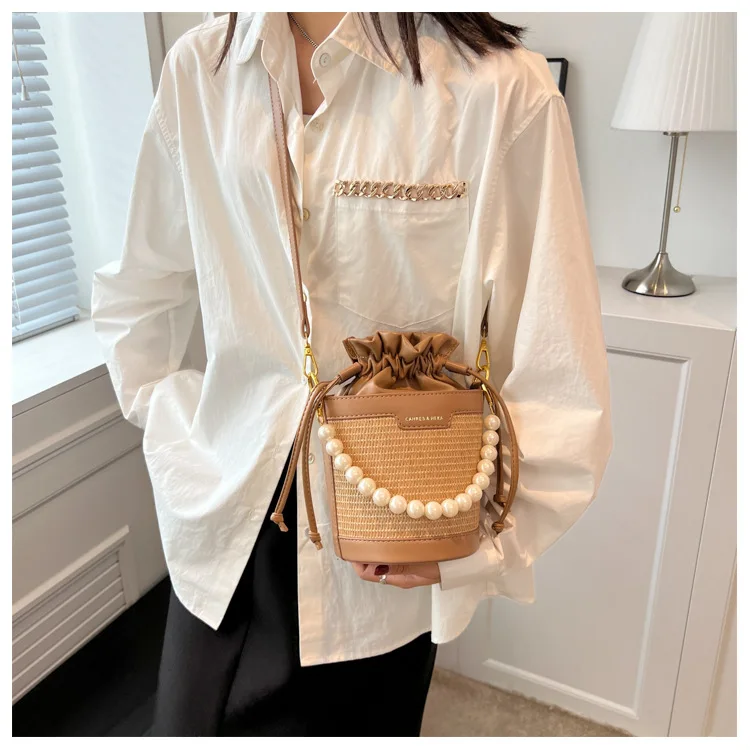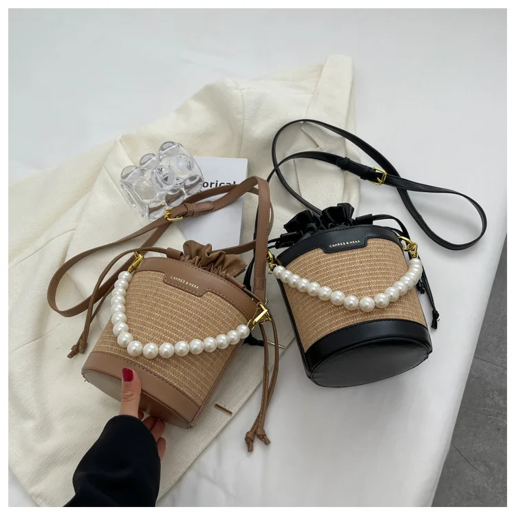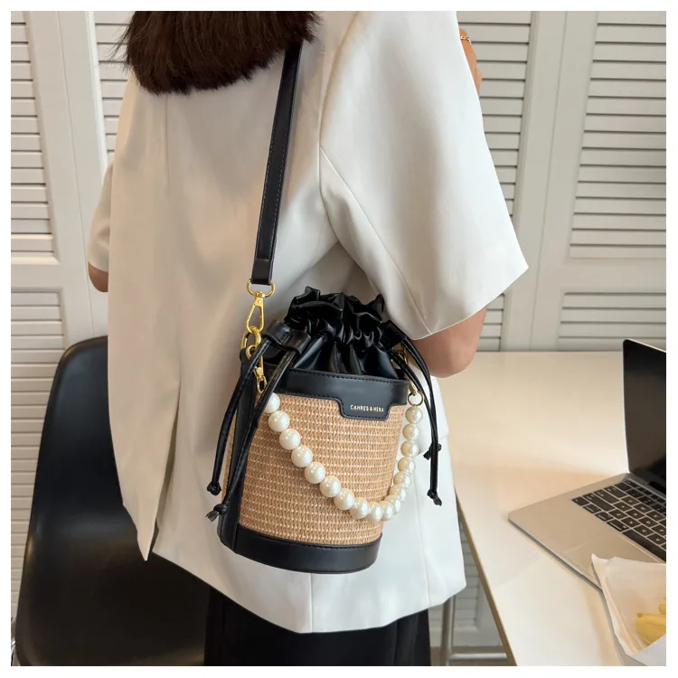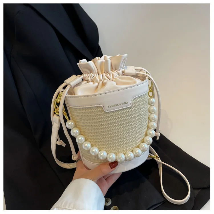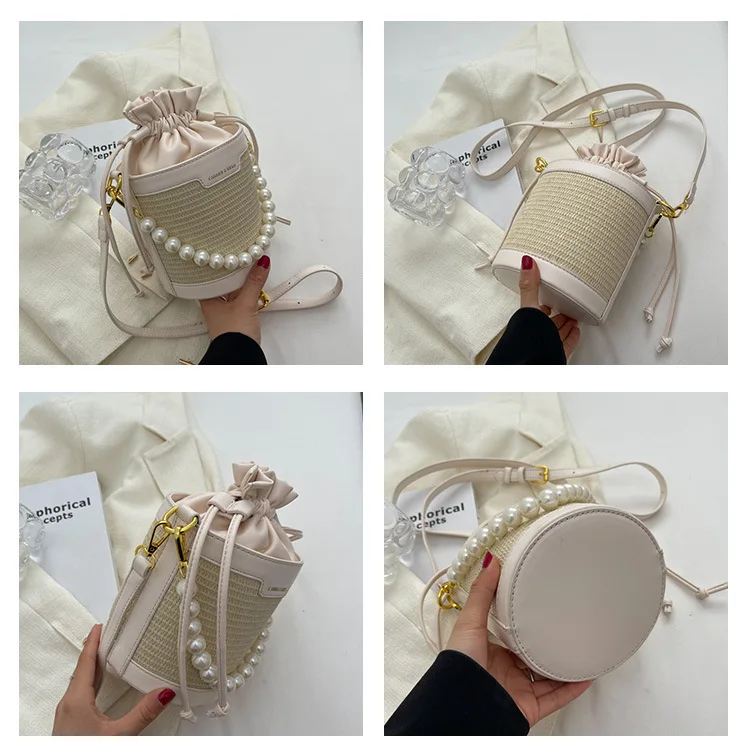 Weiyinxing Knitting Small Crossbody Bags Women Patchwork Design Pearl Bucket Packs Female Elegant Drawstring Straw Woven Bag