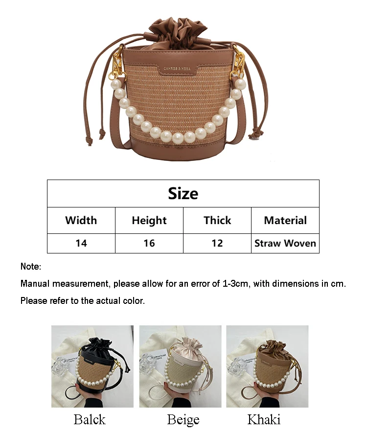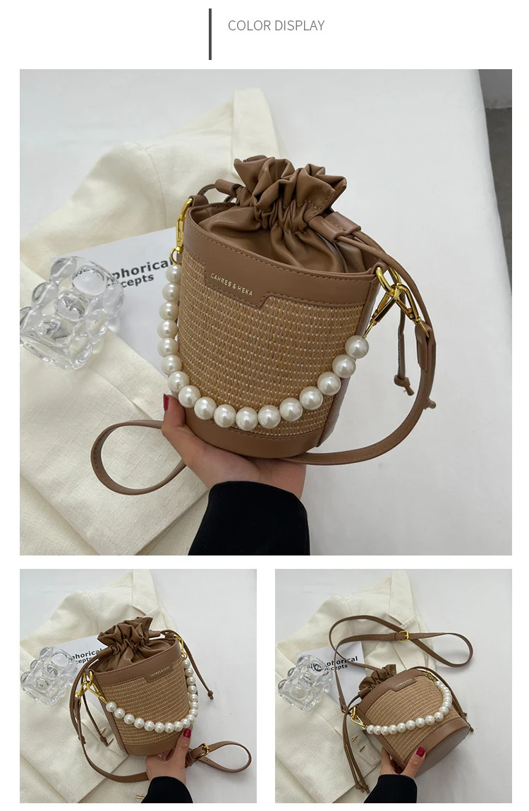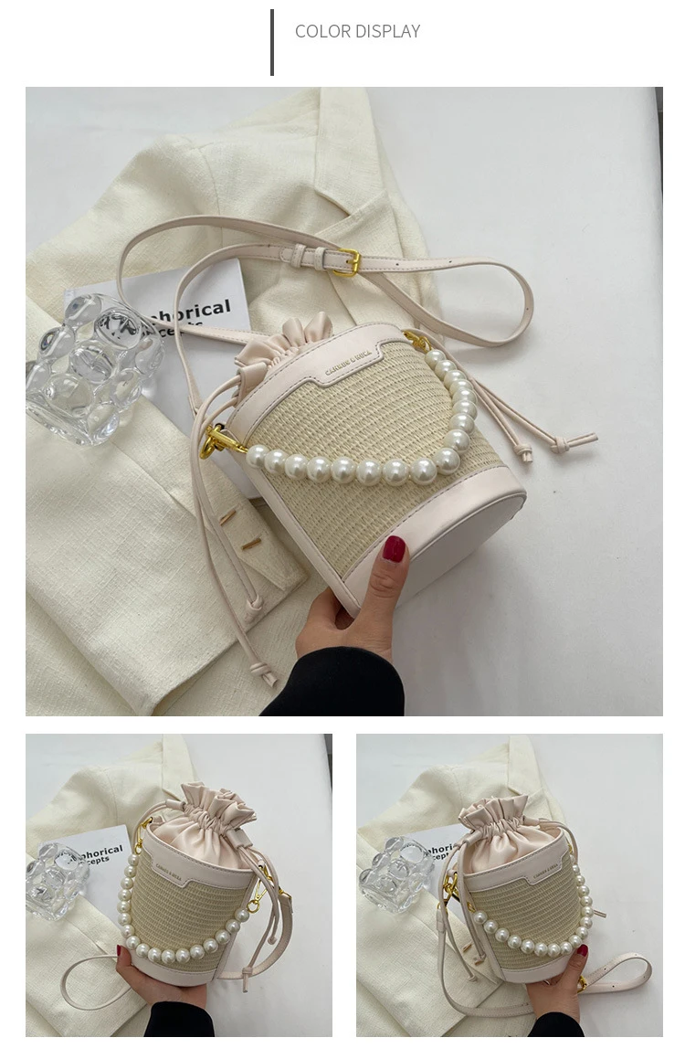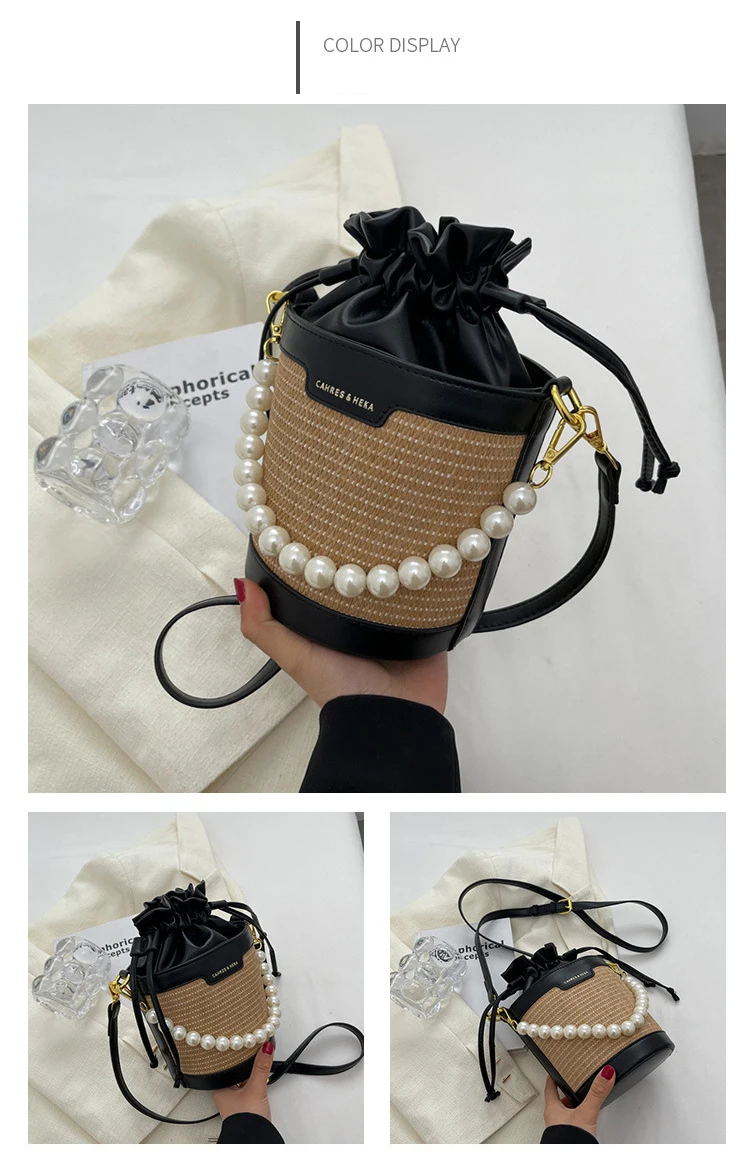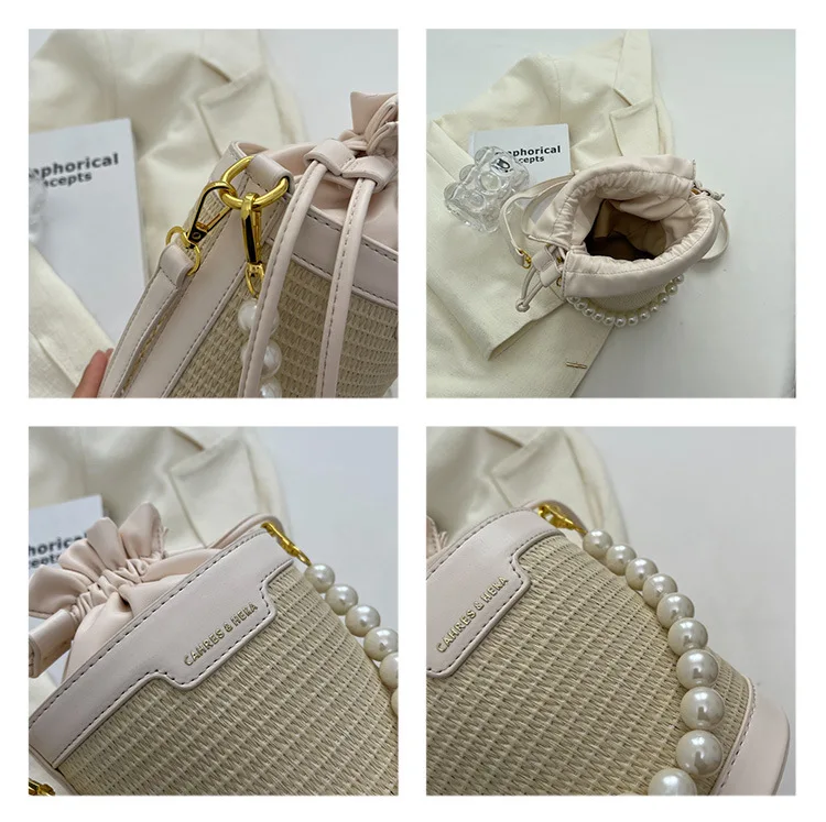 Weiyinxing Knitting Small Crossbody Bags Women Patchwork Design Pearl Bucket Packs Female Elegant Drawstring Straw Woven Bag
