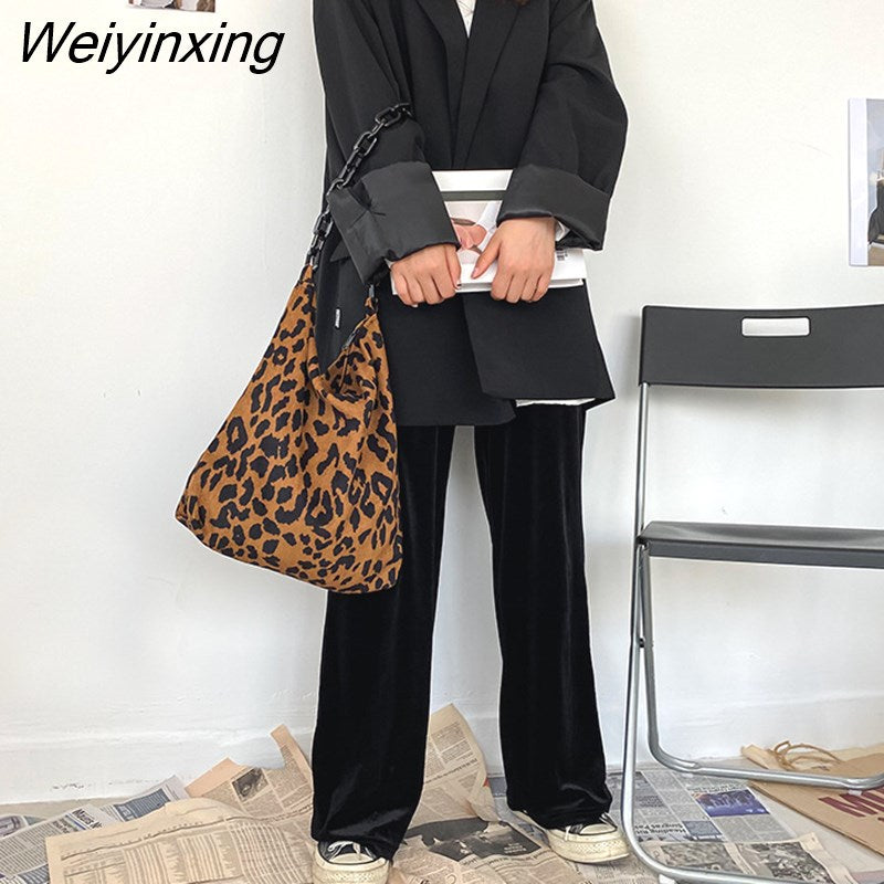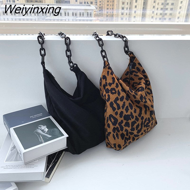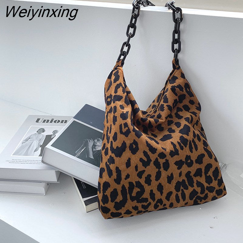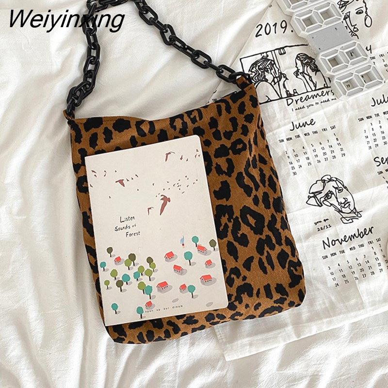 Weiyinxing New Autumn Winter Corduroy Shoulder Bags Retro Leopard Pattern Handbag Thick Chain Bags Female Daily Warm Soft Crossbody