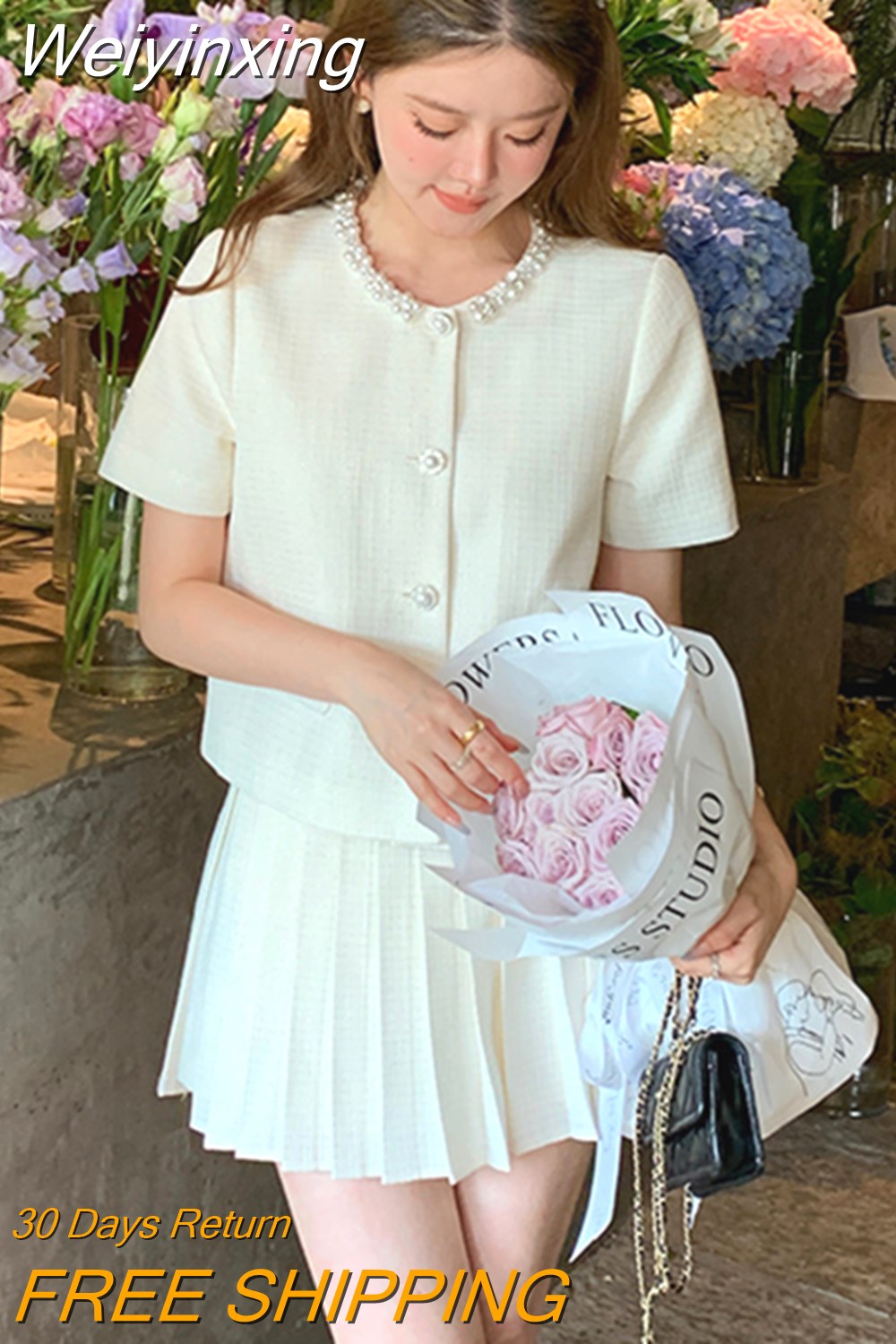 Weiyinxing Quality French Small Fragrance Two Piece Set Women Luxury Beading Shirt Top + Skirt Suits Summer Korean Sweet 2 Piece Sets