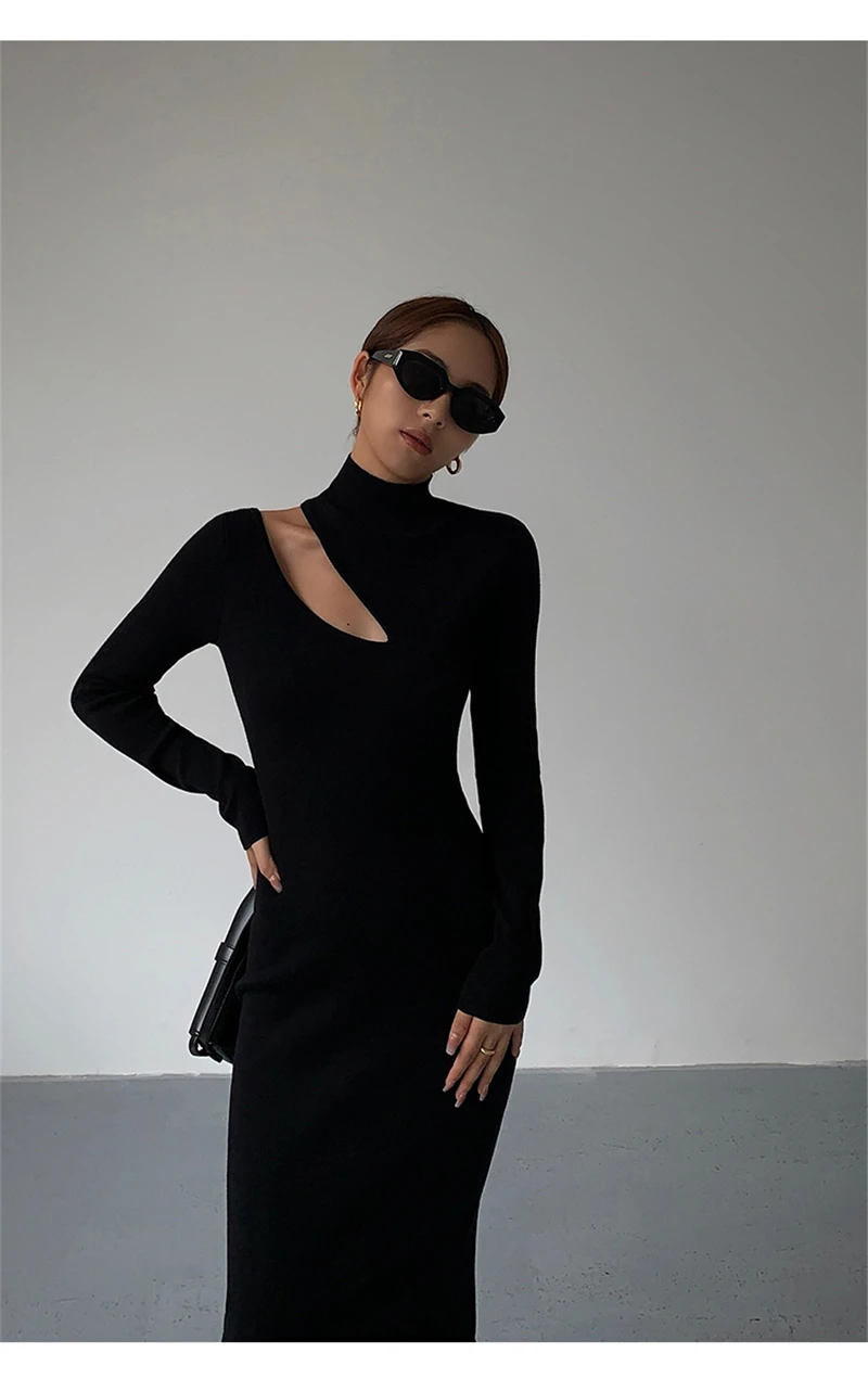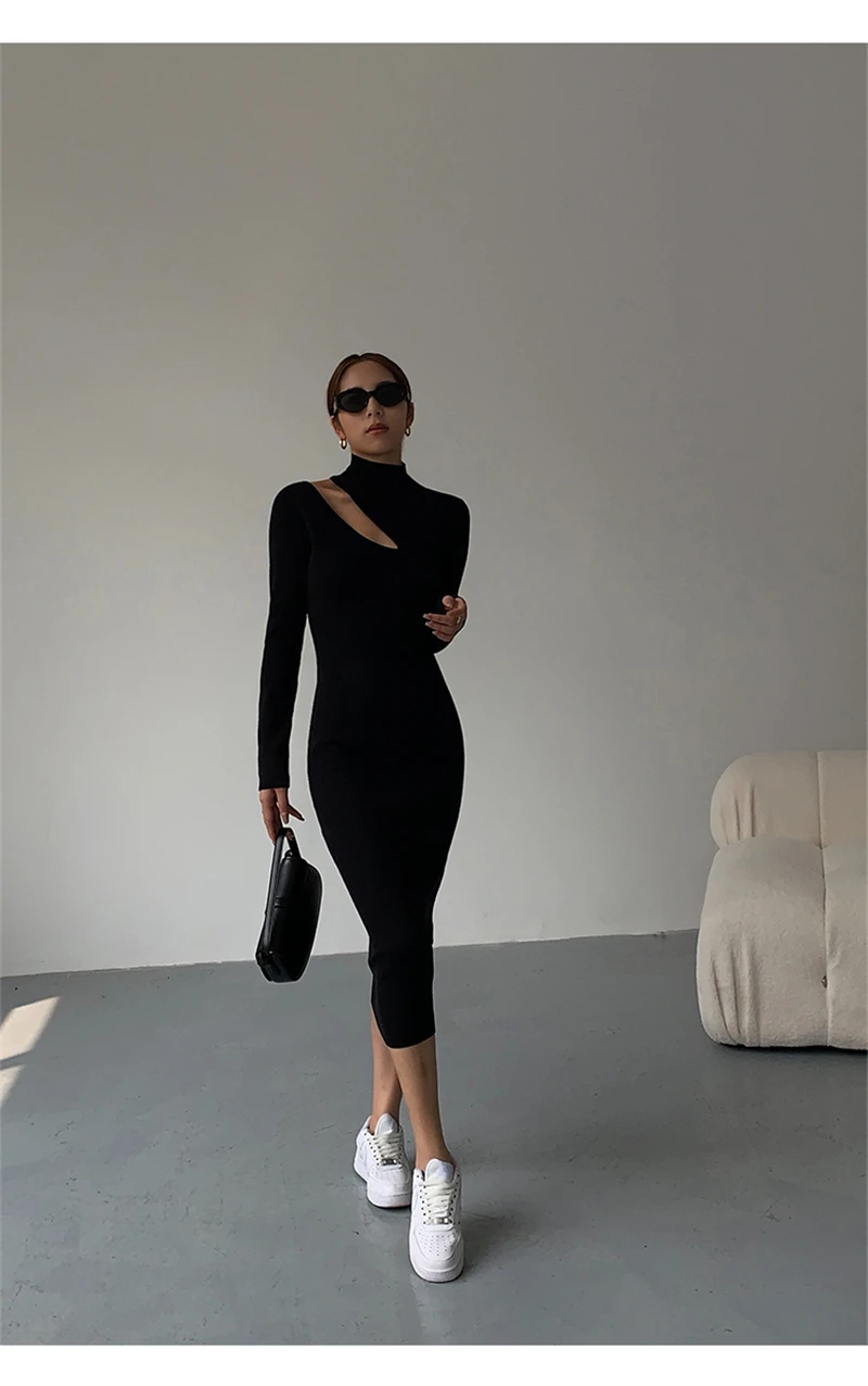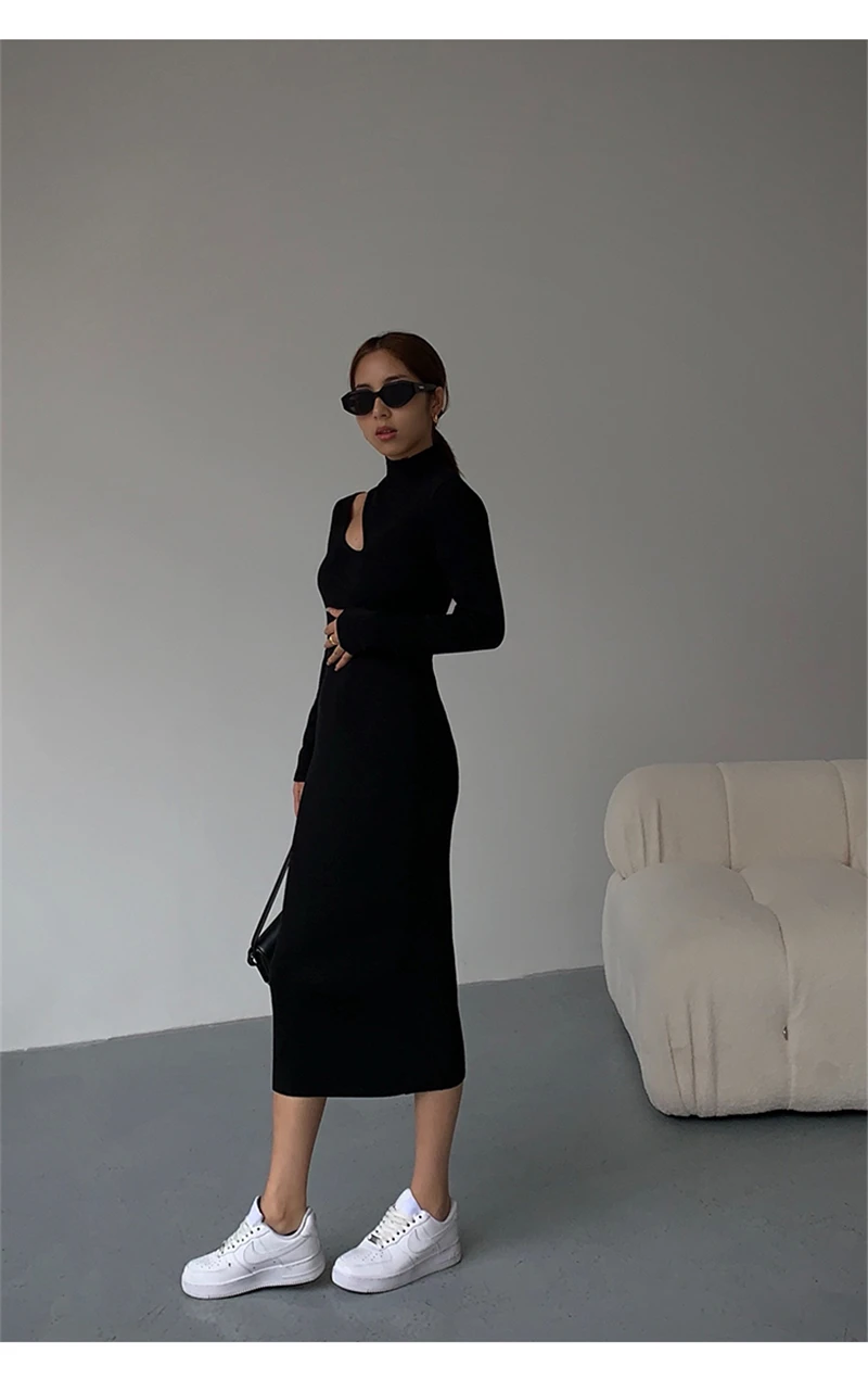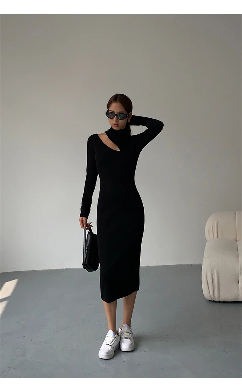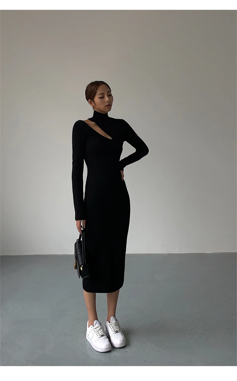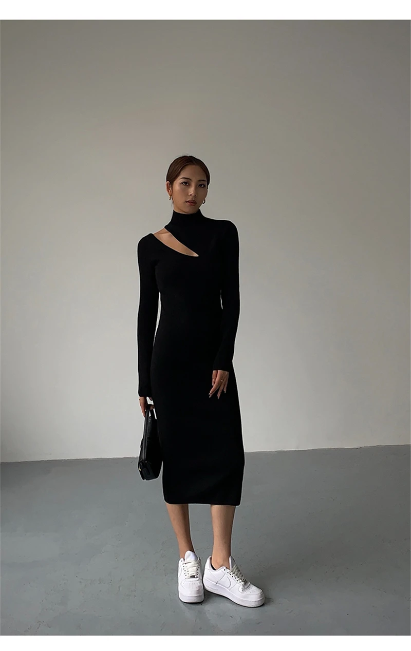 Weiyinxing Turtleneck Knitted Dress Black Slim Women Minimalist Elegant Long Sleeve Midi Dress Party Office Bodycon Vestidos O146