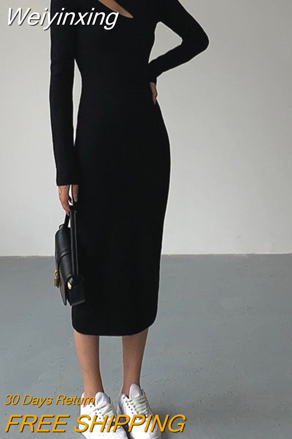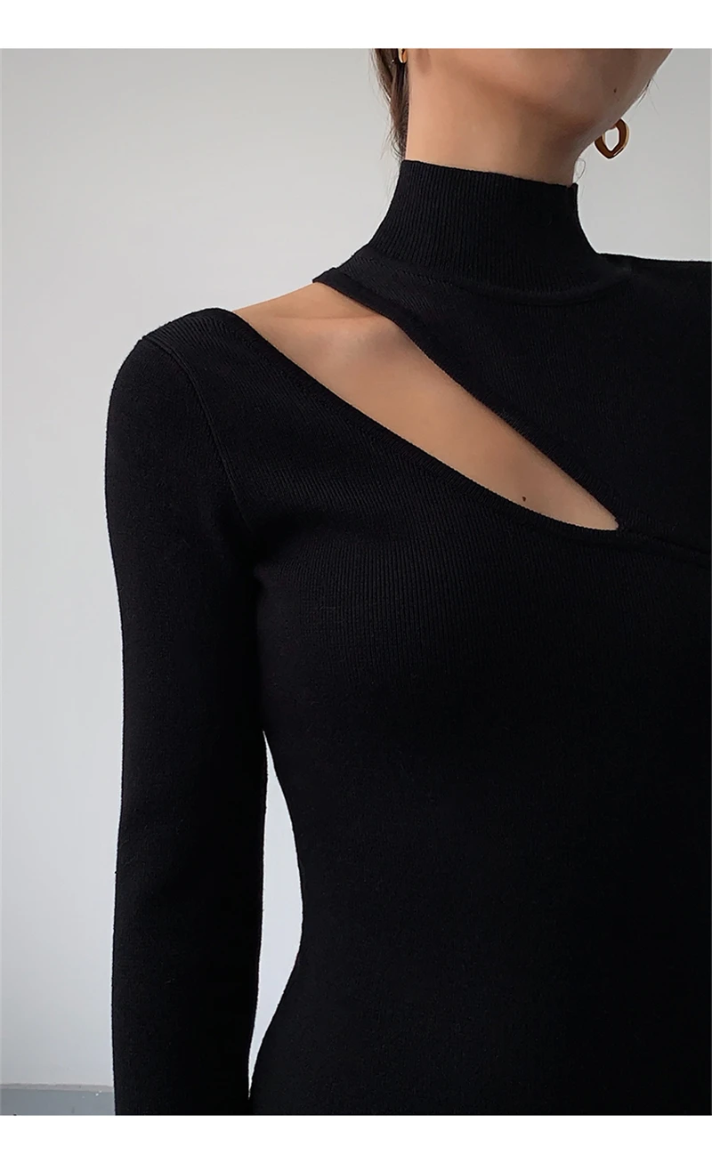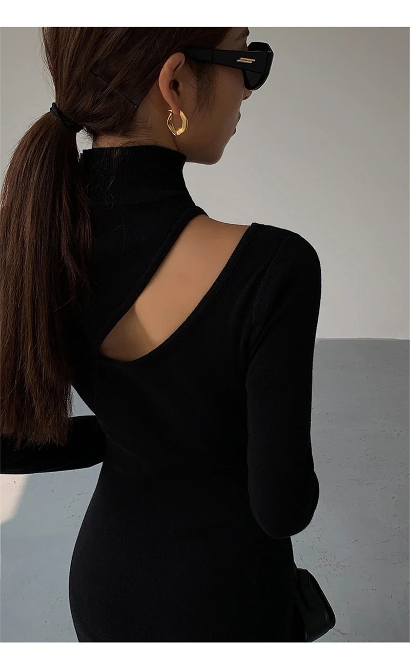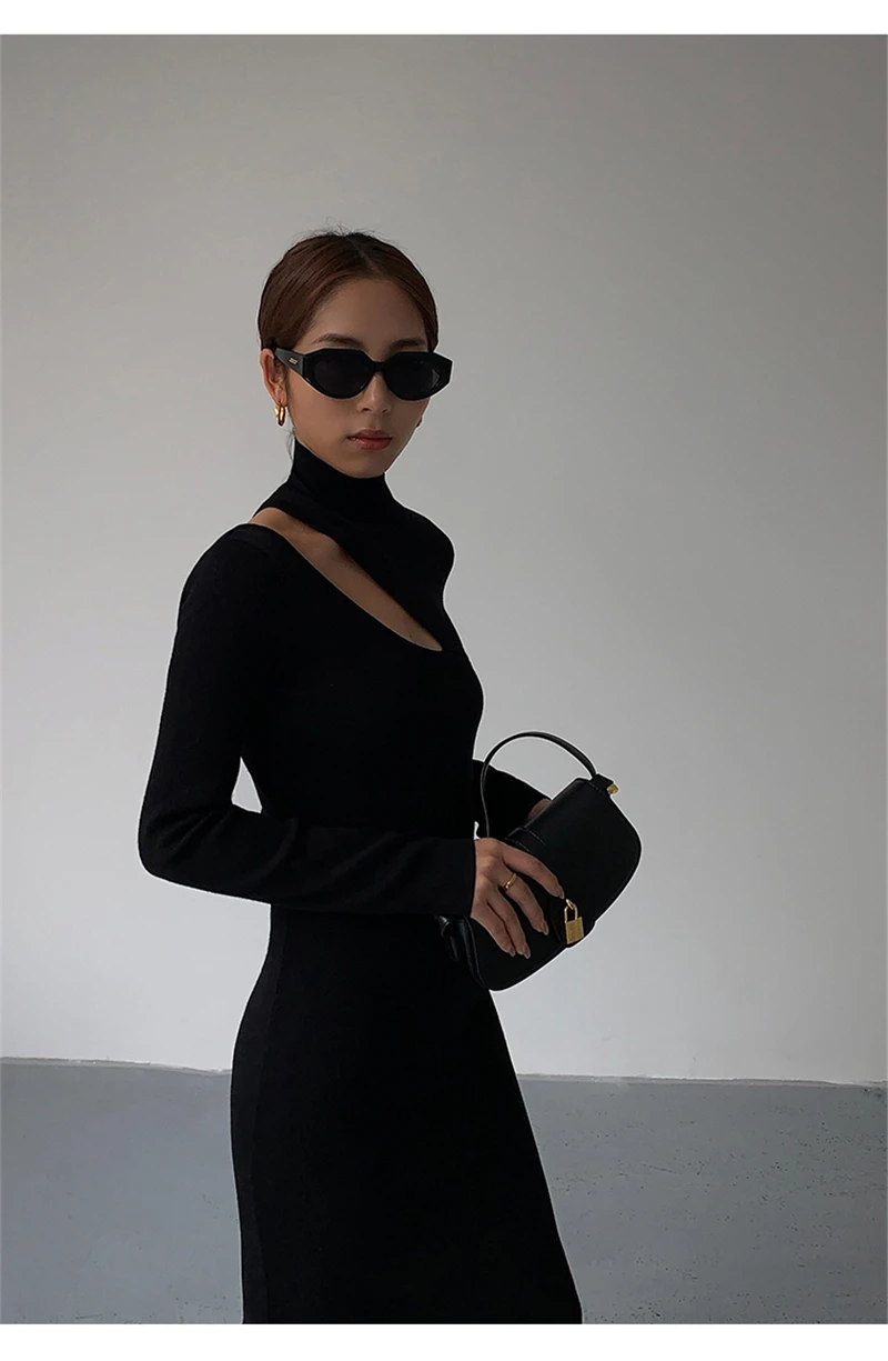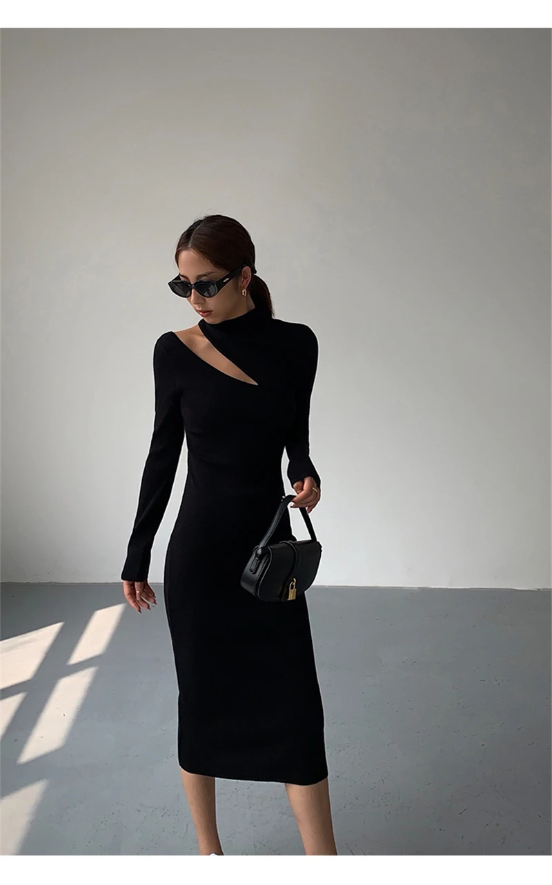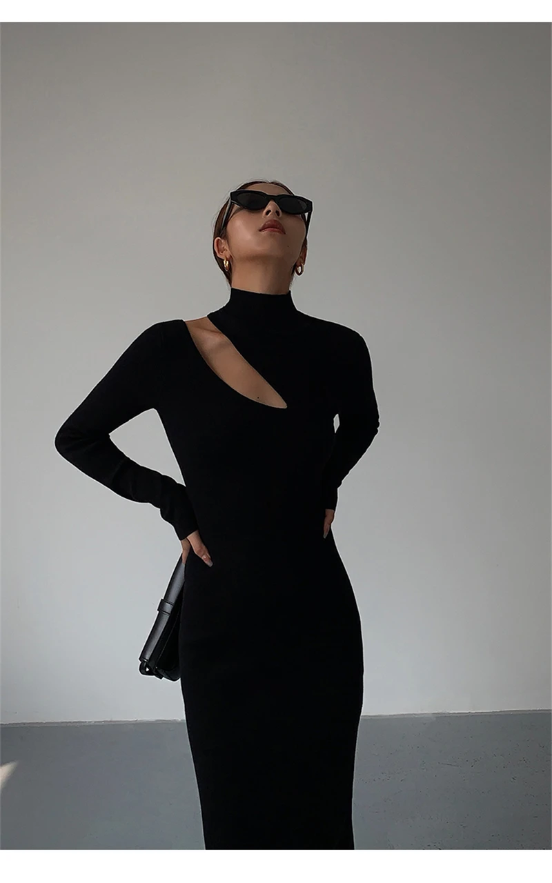 Weiyinxing Turtleneck Knitted Dress Black Slim Women Minimalist Elegant Long Sleeve Midi Dress Party Office Bodycon Vestidos O146